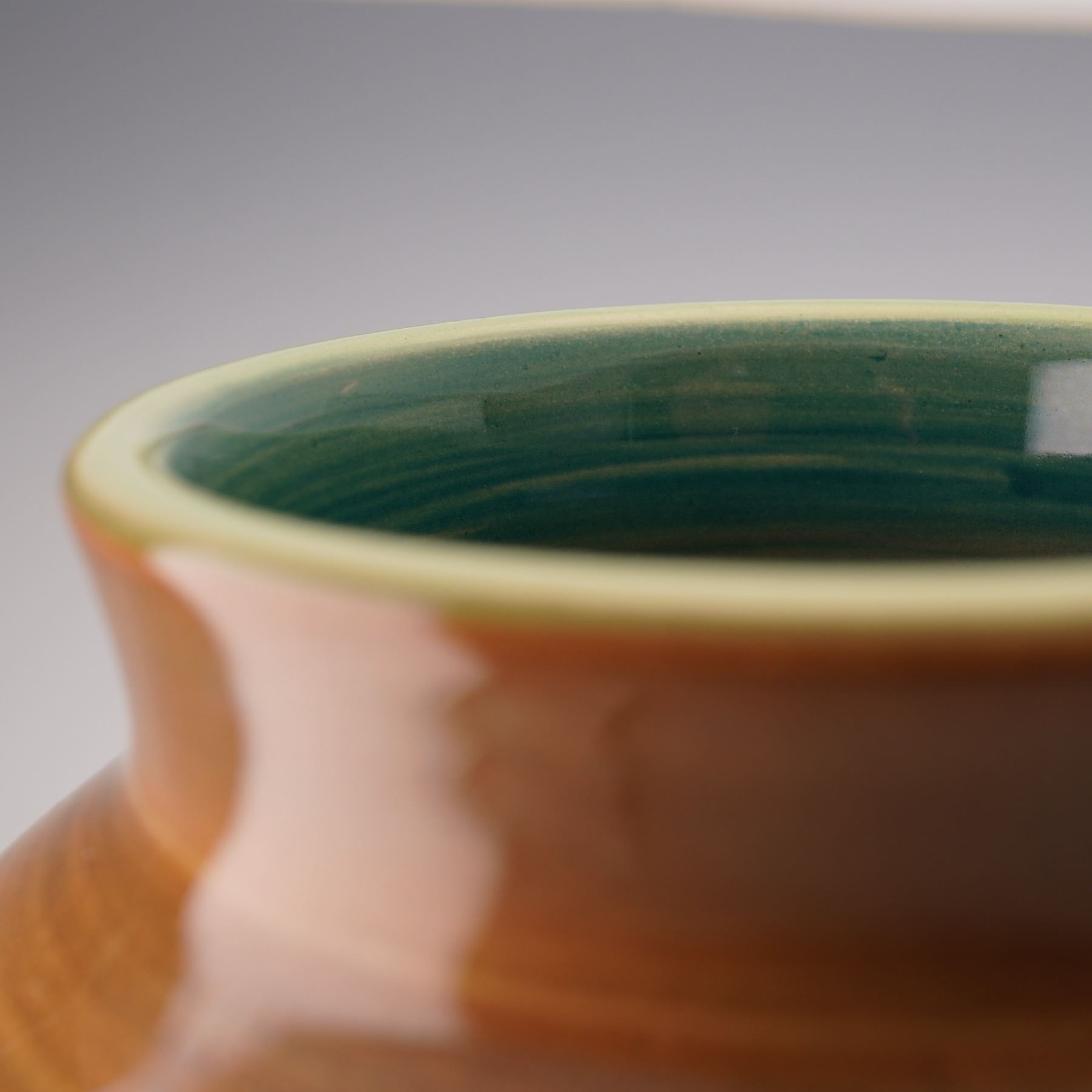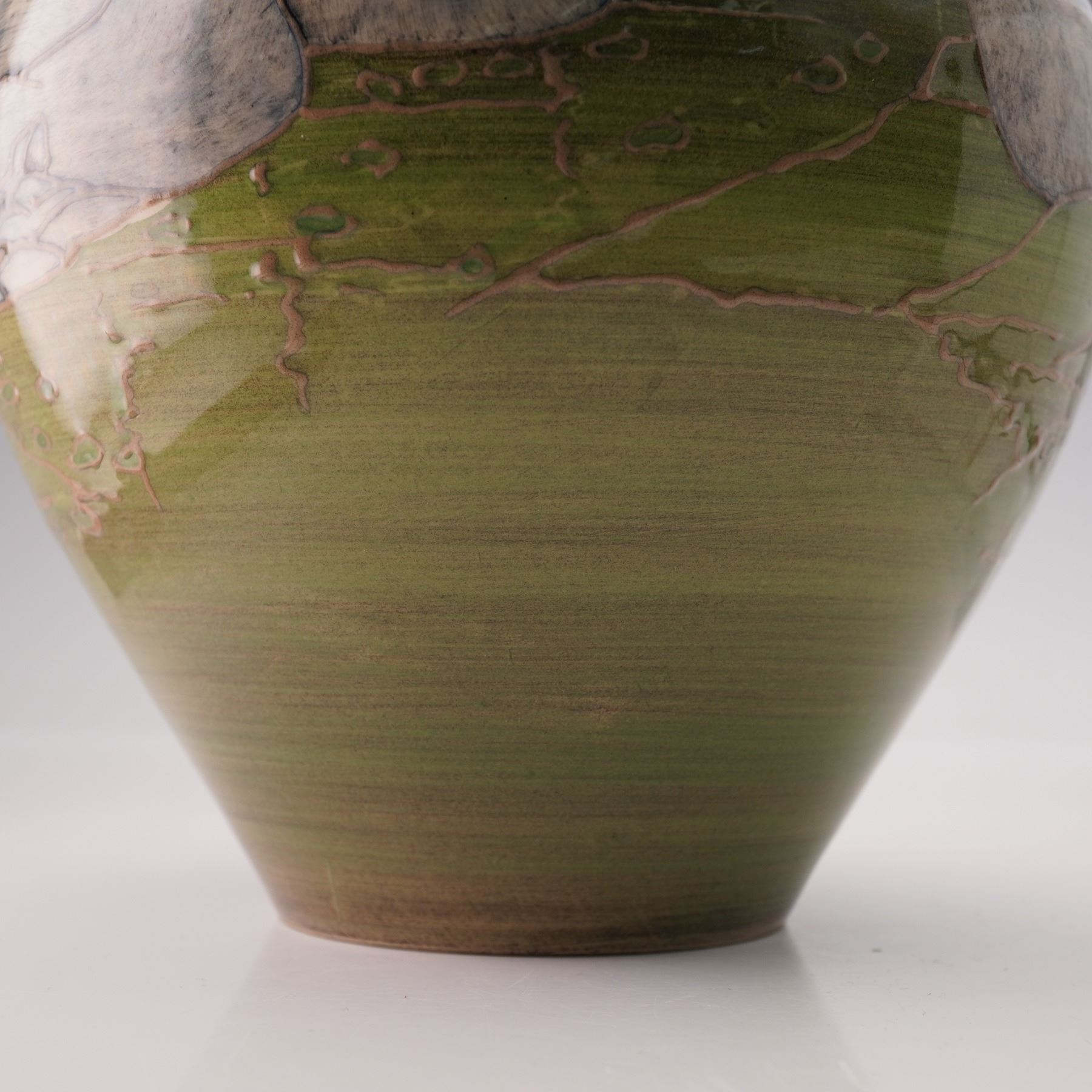 A delightful studio art pottery vase designed and decorated by renowned ceramicist Sally Tuffin. Features a tube lined continuous decoration of resting and grooming otters against an olive and amber striated ground. The interior finished in gloss celadon tone. Signed "S.T. des" and "VMW", It is also marked "Trial". Moorcroft backstamp.