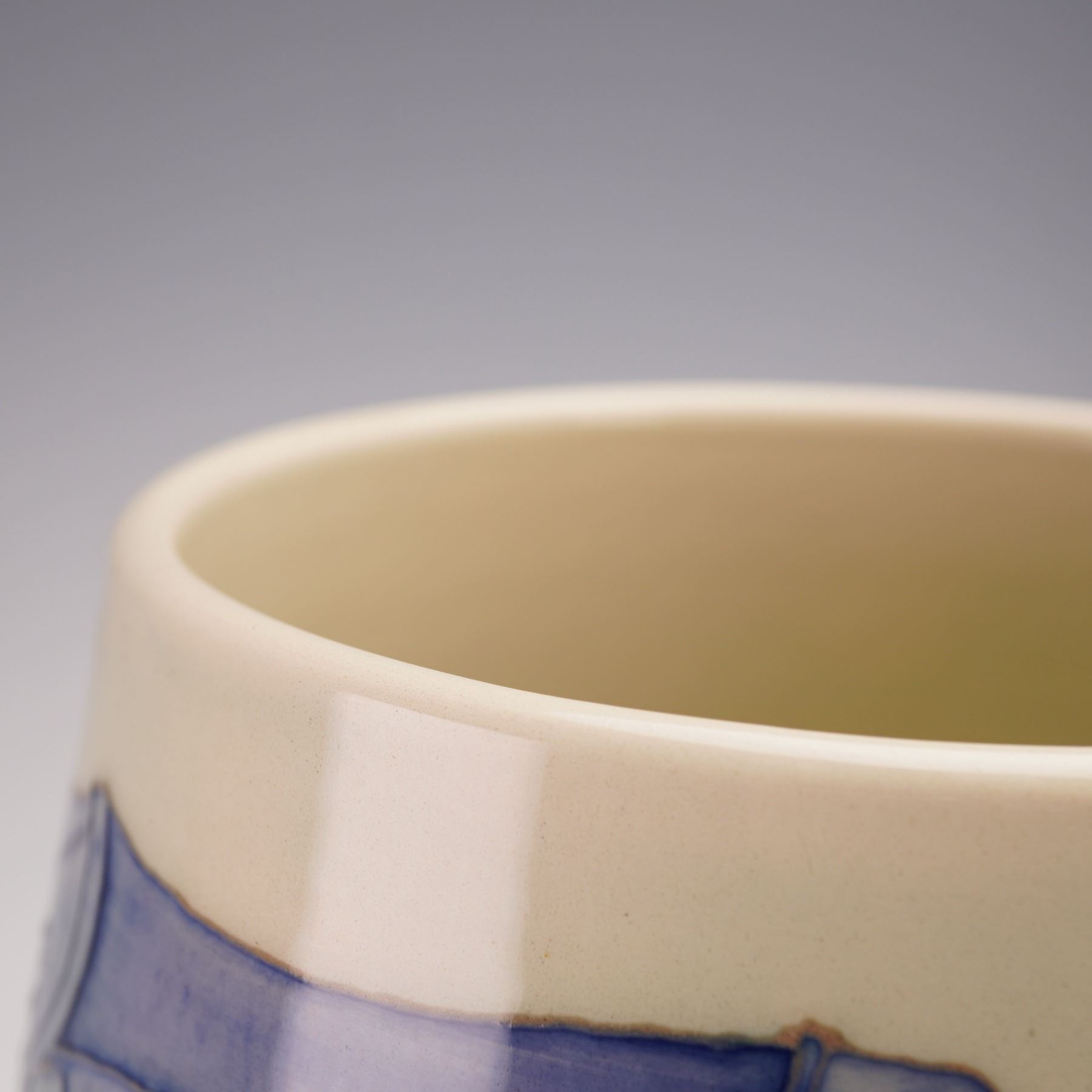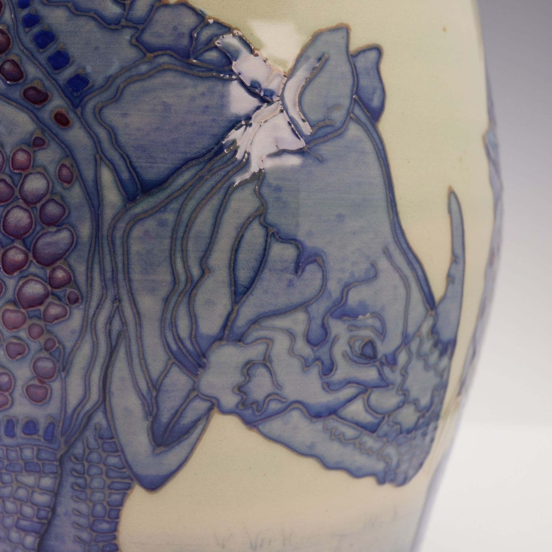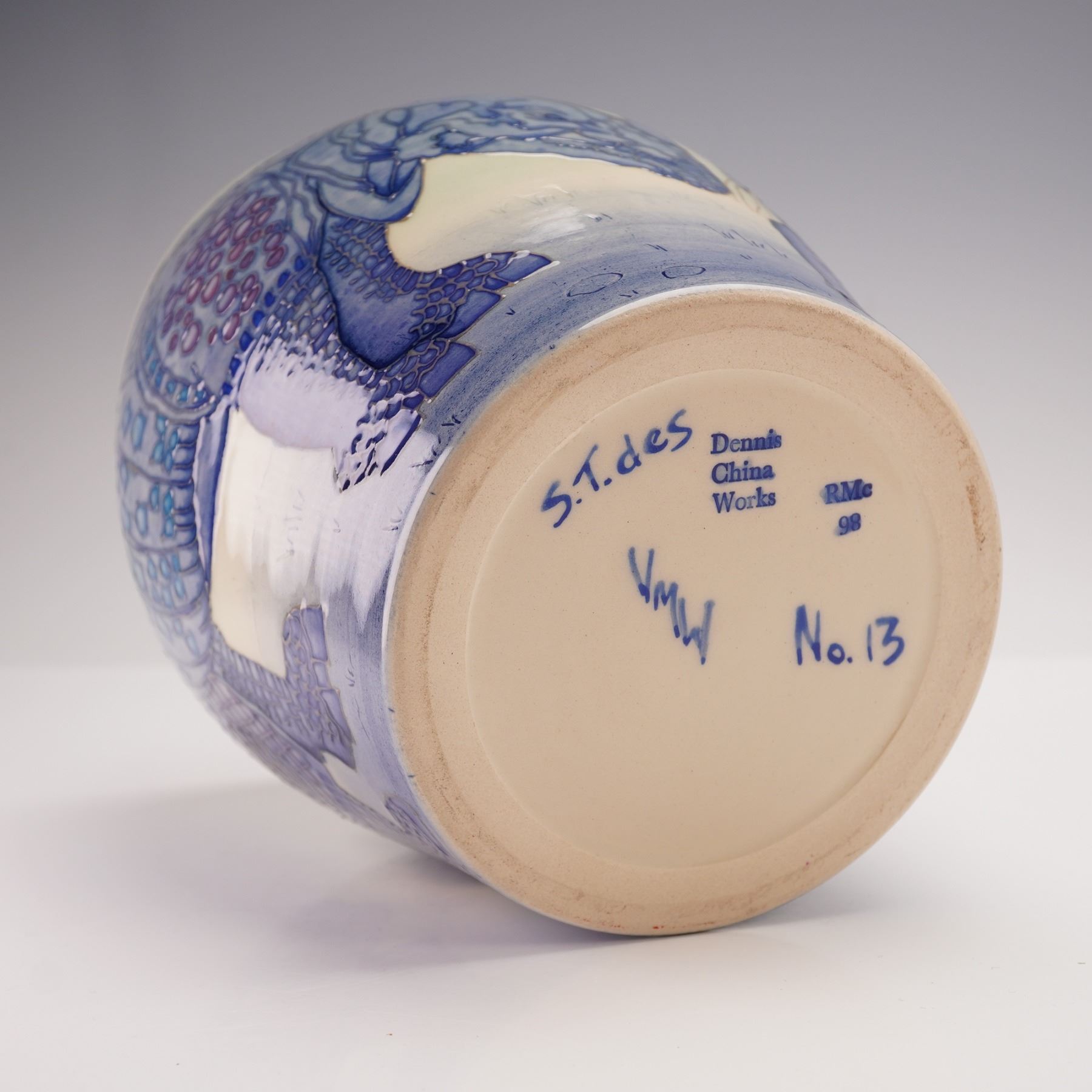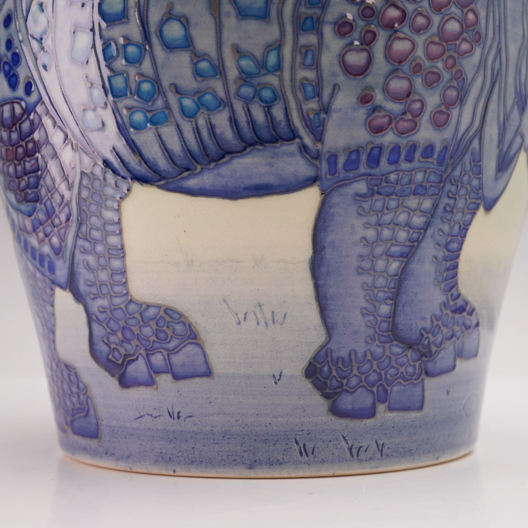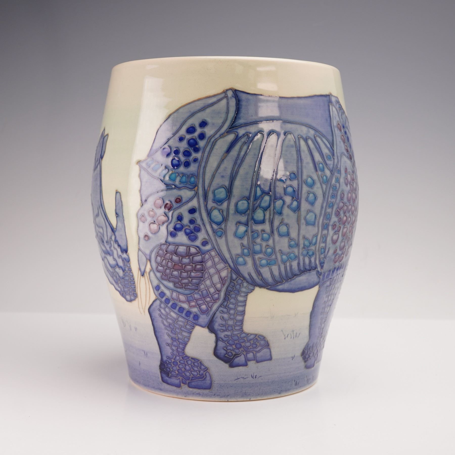 A superb pottery vase designed by Sally Tuffin. It is decorated with a continuous study of rhinoceroses in tube lined technique and in beautiful shades of blue and lavender, set against a pale ground. Produced in a numbered edition, this is no. 13. Signed "S.T. des" and "VMW". Dennis Chinaworks backstamp.