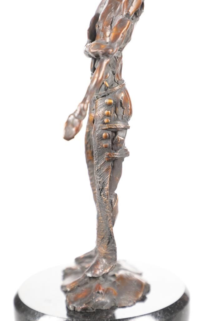 For your consideration is an Original Signed Dennis Harrington Bronze, "Cowboy Study", Limited Edition #6/100. Harrington is a Bozeman, Montana artist and owner of the Planet Bronze gallery. Harrington is the artist who sculpted the larger-than-life bronze grizzly bear, "Guardian Spirit" on permanent display at the Bozeman Yellowstone International Airport in Montana. Well known for his cowgirls of the contemporary West sculptures, sculpting "The West" has become a full time profession for him. This bronze sculpture exudes both the untamed beauty and Western ruggedness Harrington's depict. Standing on a round, black marble base, this cowboy is dressed in concho trimmed batwing chaps and a cowboy hat while his evocative sinewy form, pantless shirtless, a juxtaposition. The bronze is both beautiful and a powerful image. Measures 10.5"H x 6"W, base is 5" diameter. Weight 4lb 2 oz.*