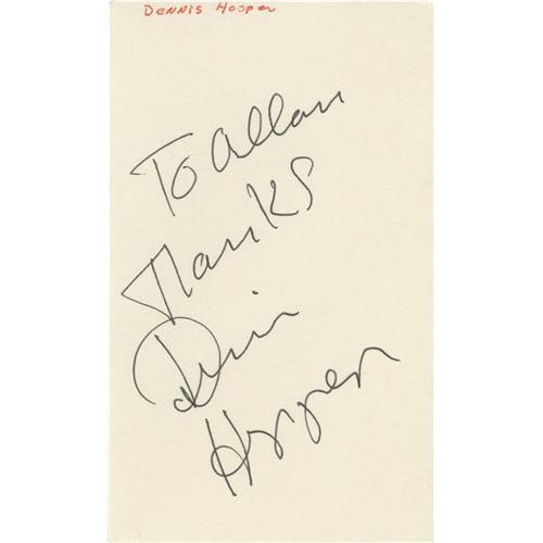<B>Dennis Hopper Autograph.</B></I> A 3" x 5" notecard inscribed and signed by Hopper in black ink, in Excellent condition with very mild tanning.<BR><BR><b>Shipping:</b> Flat Material, Small (<a target="_blank" href="http://www.heritageauctions.com/common/shipping.php">view shipping information</a>) <BR><BR><B>Important no