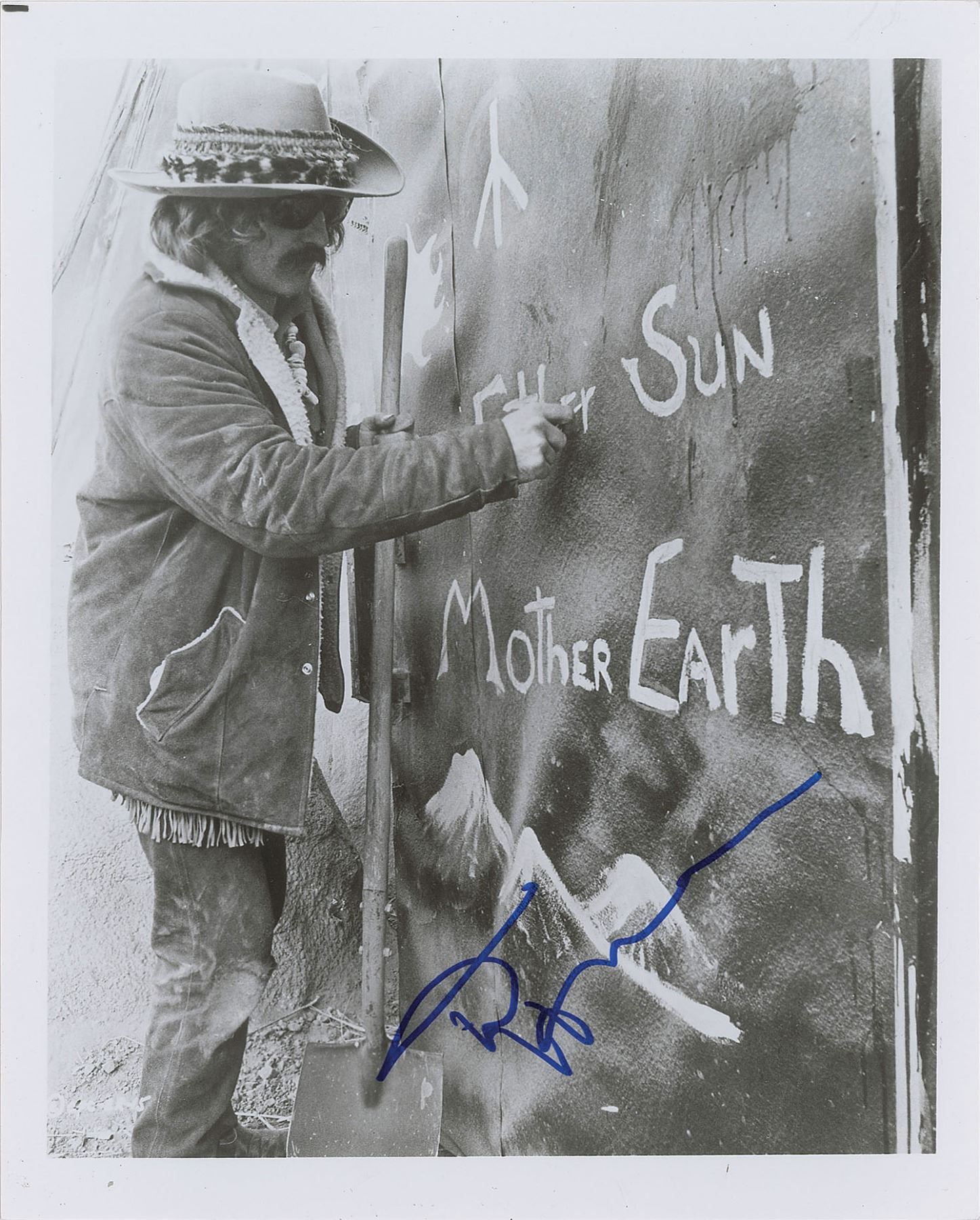 Glossy 8 x 10 photo of Dennis Hopper as the freewheeling biker Billy, one of the main characters from the 1969 road movie Easy Rider, signed in blue felt tip. In fine condition.