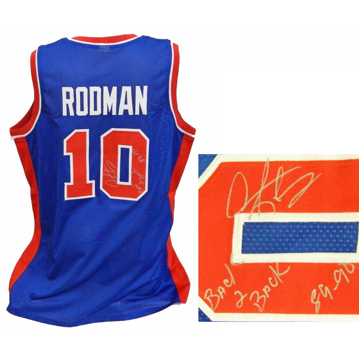 Dennis Rodman signed blue custom basketball jersey with 'Back 2 Back 89-90' inscription. Item comes with a Schwartz Sports Memorabilia tamper-proof numbered hologram and Certificate of Authenticity which can be verified online.