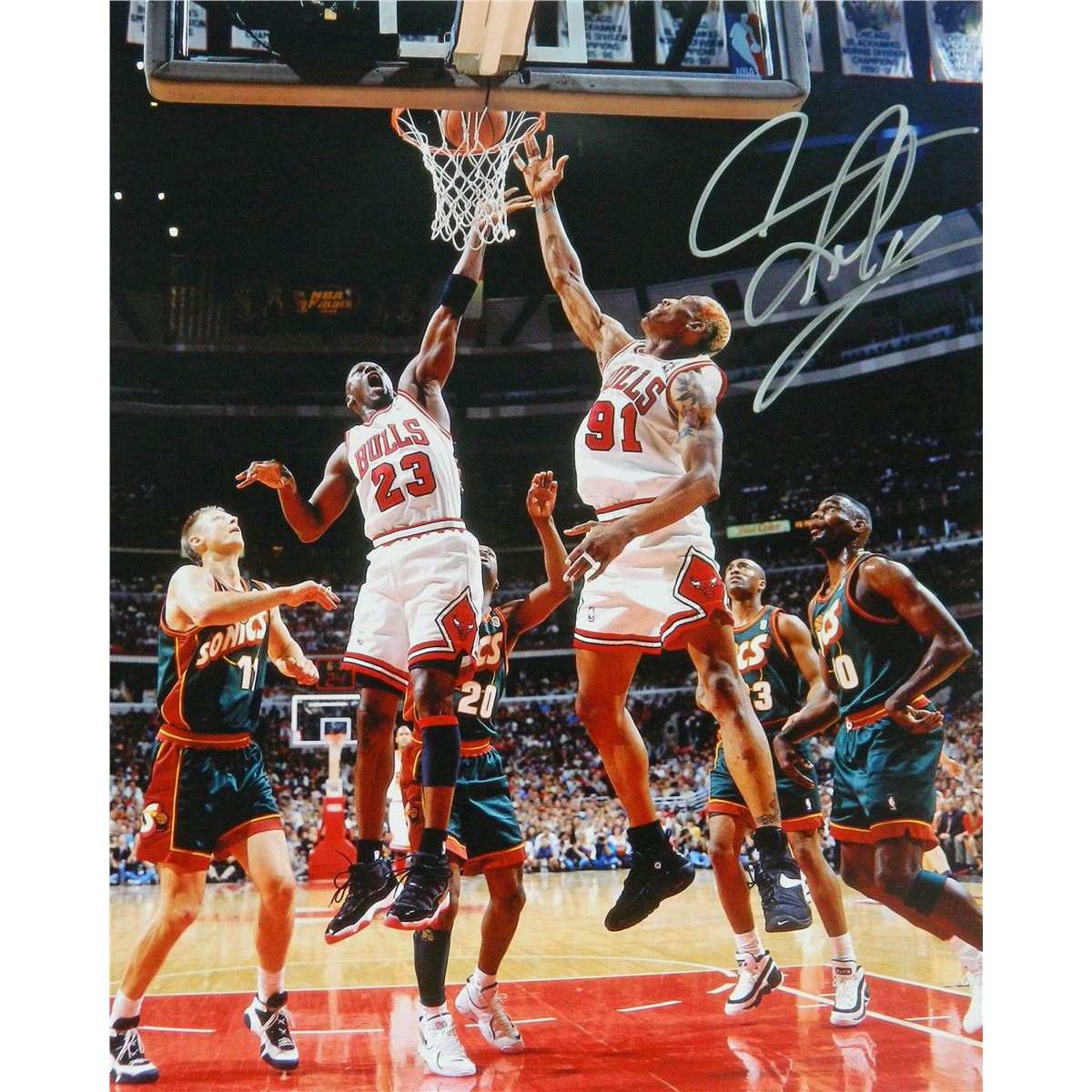Dennis Rodman signed Chicago Bulls action 16x20 photo with Michael Jordan. Item comes with a Schwartz Sports Memorabilia tamper-proof numbered hologram and Certificate of Authenticity which can be verified online.