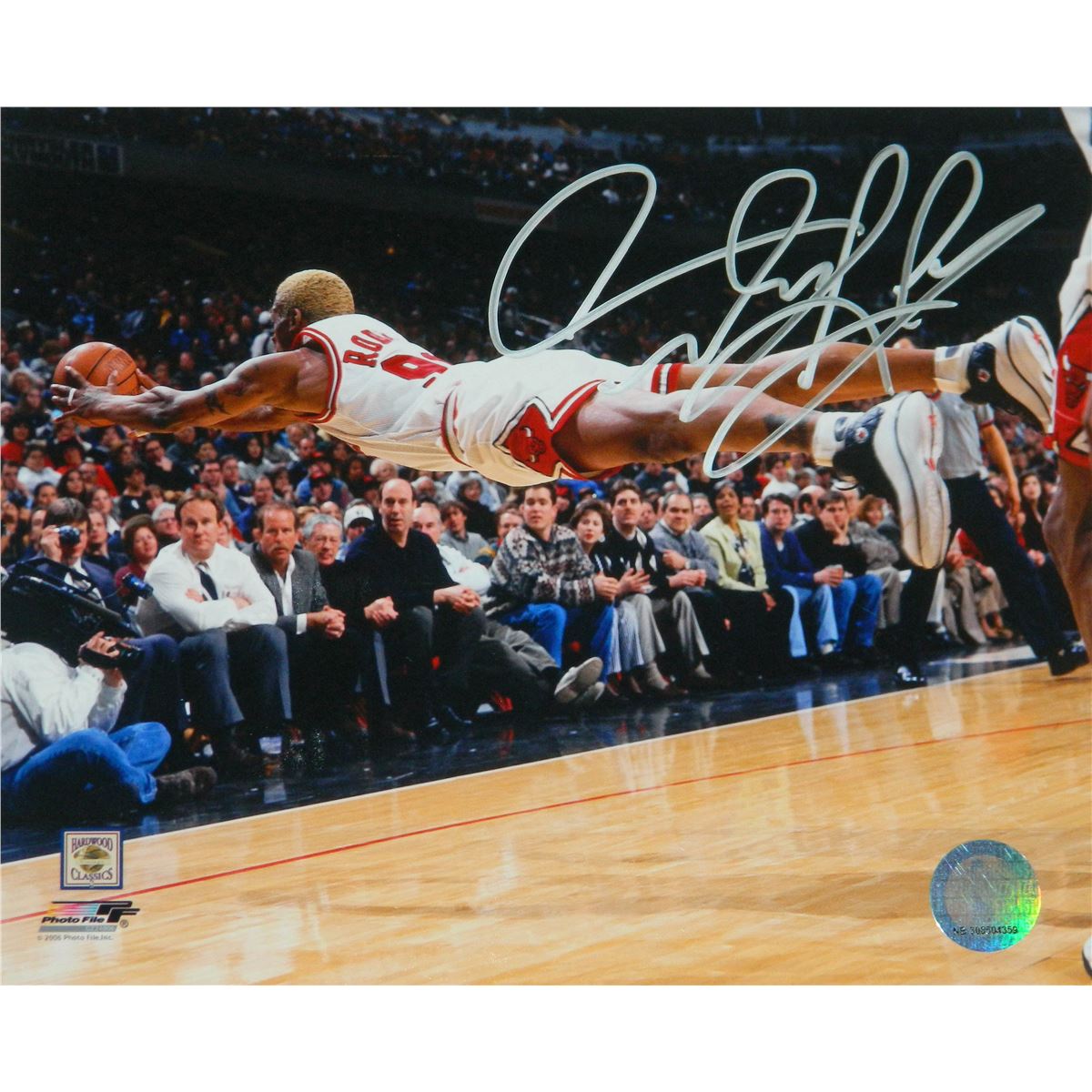 Dennis Rodman signed Chicago Bulls diving action 8x10 photo. Item comes with a Schwartz Sports Memorabilia tamper-proof numbered hologram and Certificate of Authenticity which can be verified online.