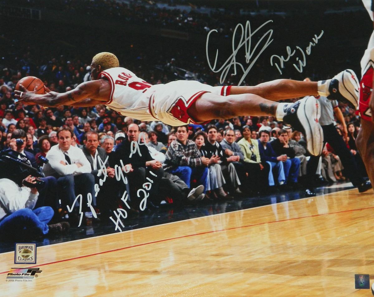 Dennis Rodman signed Chicago Bulls diving for basketball action 16x20 photo with 'The Worm, 3 Peat 96-98, HOF 2011' inscriptions. Item comes with a Schwartz Sports Memorabilia tamper-proof numbered hologram and Certificate of Authenticity which can be ver