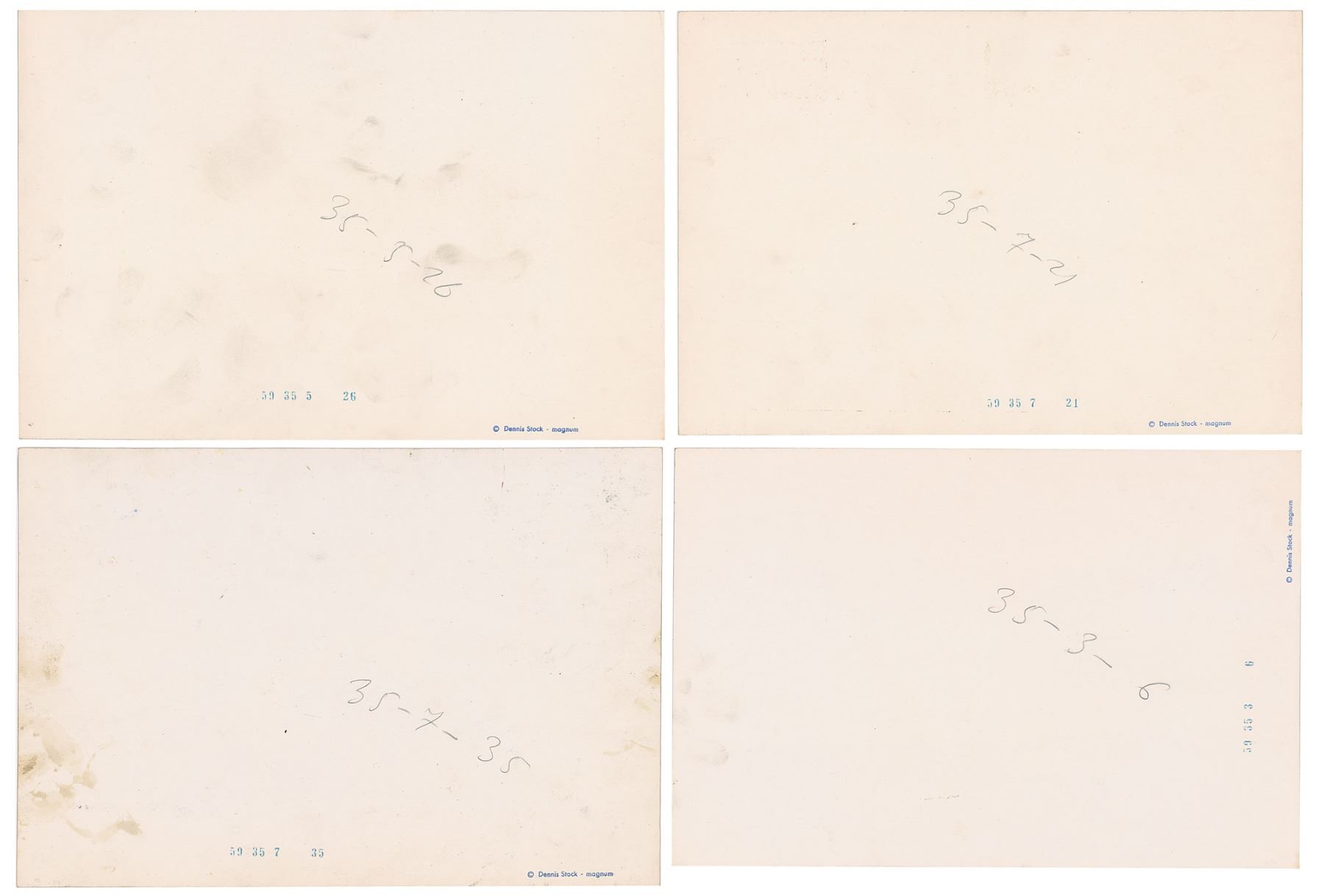 American photojournalist (1928–2010) remembered for his photographs of James Dean, jazz musicians, and contrasting regional scenes. Four original vintage semi-glossy 11.75 x 8 silver gelatin photos taken by Magnum photographer Dennis Stock, including a portrait of a man in sunglasses, two outdoor musical scenes, and one street scene. All bear Dennis Stock/Magnum credit stamps on the reverse. In overall fine condition.