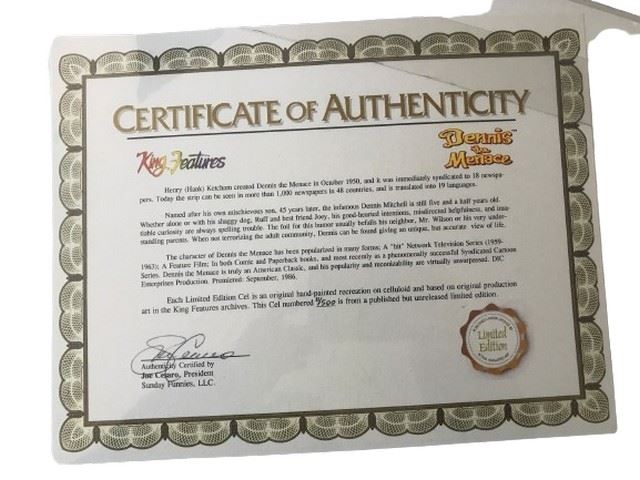 Limted Edition Animation Cel featuring Dennis the Menace. 11/500 - With Certificate of authenticity (11"x12)