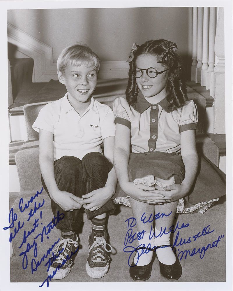 Glossy 8 x 10 photo of Dennis and Margaret, signed and inscribed in blue felt tip, “To Evan, All the best, Jay North, Dennis the Menace,” and “To Evan, Best wishes, Jean Russell ‘Margaret.’” In fine condition, with a couple trivial surface dings.