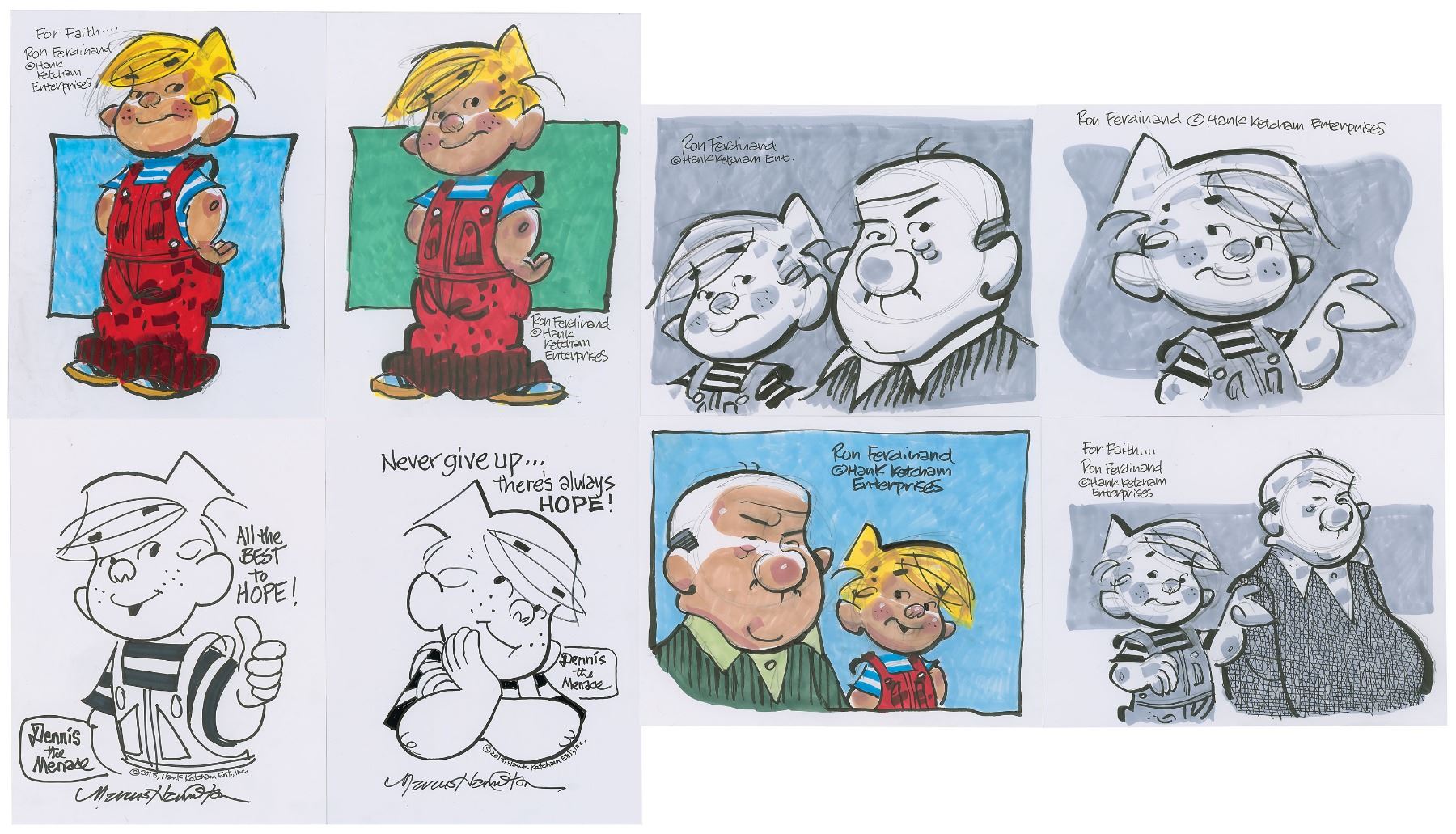 Appealing group lot of eight original sketches of Dennis the Menace by comic artists Ron Ferdinand and Marcus Hamilton, each accomplished in graphite or felt tip on white 8.5 x 11 and 11 x 8.5 sheets; of the six Ferdinand sketches, three are done in color, three feature older neighbor, Mr. Wilson, and two are inscribed to "Faith"; the two Hamilton sketches are inscribed to "Hope." Both artists have added "Hank Ketcham Enterprises" copyrights to each sheet. In overall very fine condition.