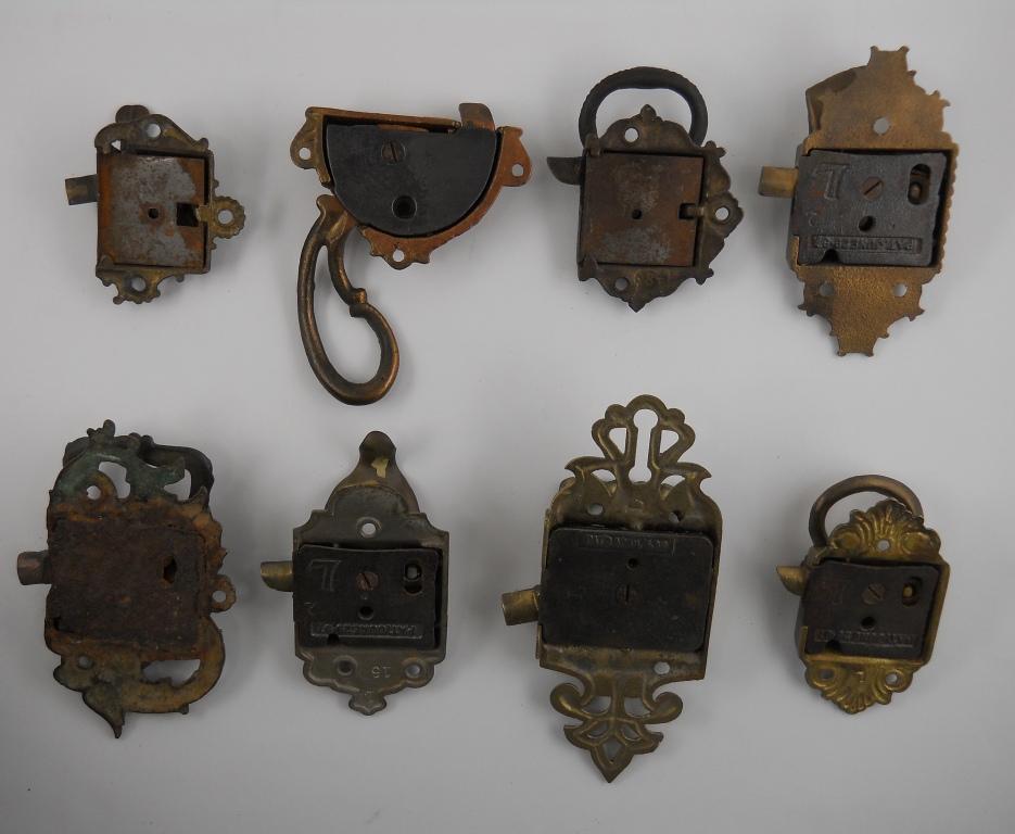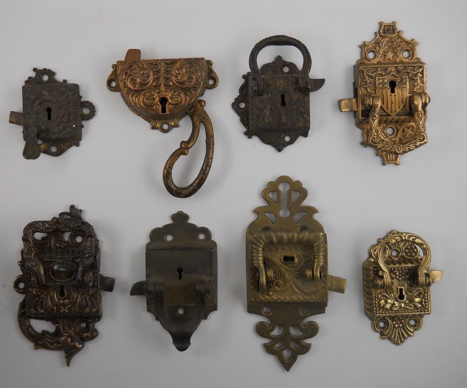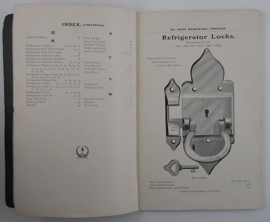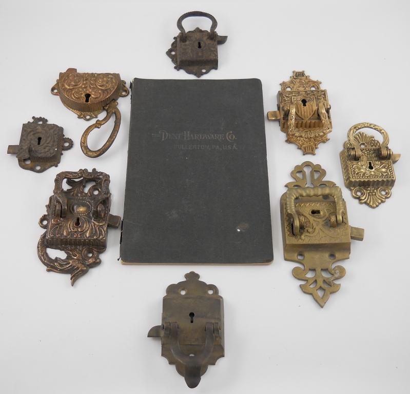 The catalog is dated 1901 from Dent Hardware Co. of Fullerton, Pa. It is 6 inches x 9-¼ inches, with 64 pages of pictures and descriptions of hardware. The hardware pieces in this lot are an assortment of brass door locks for old ice boxes and refrigerators (we do not have any of the keys for the locks). All the locks appear to be clean; see pictures for the ornate designs.