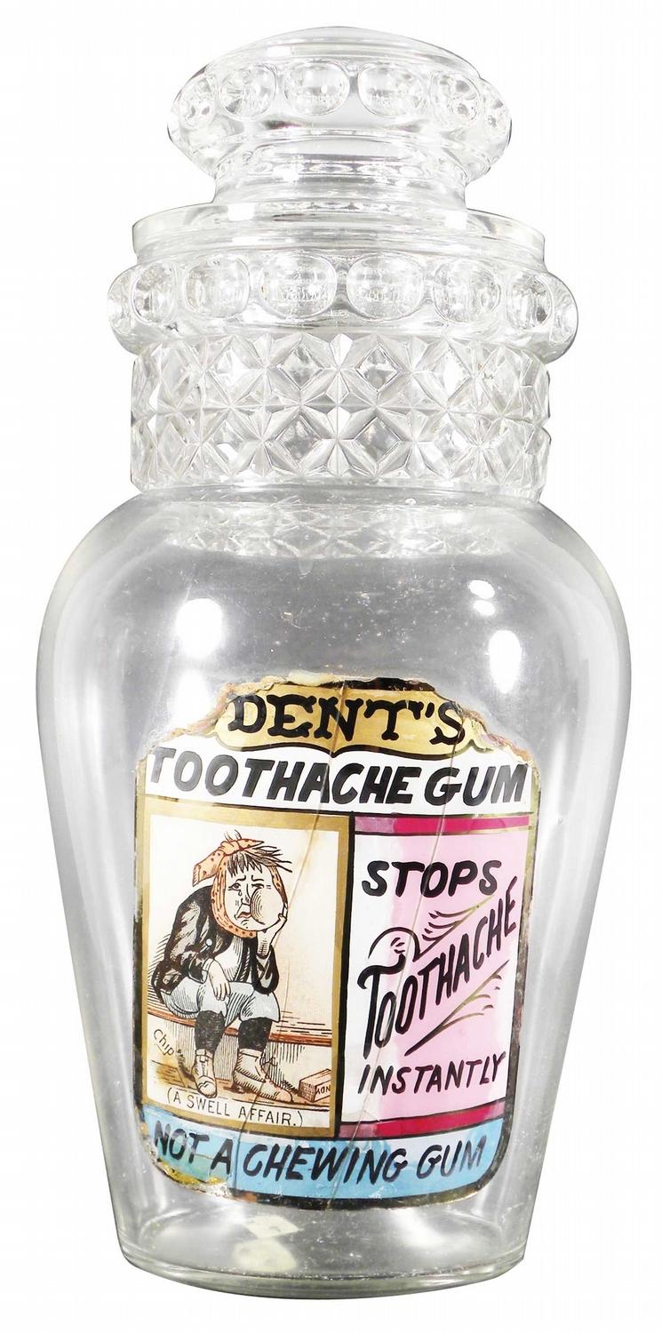 Dent's Toothache Gum Cardboard Store Display Jar. Label under glass with original lid. Not a chewing gum. Stops toothache instantly. "A Swell Affair". Two vertical cracks and chips at top and 3 corners otherwise good condition. 11 1/2 inches tall.