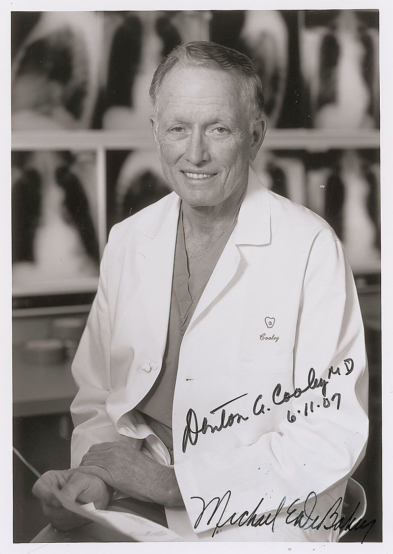 Glossy 5 x 7 photo of Dr. Cooley, signed in black felt tip by both Cooley and Michael DeBakey. In very fine condition.