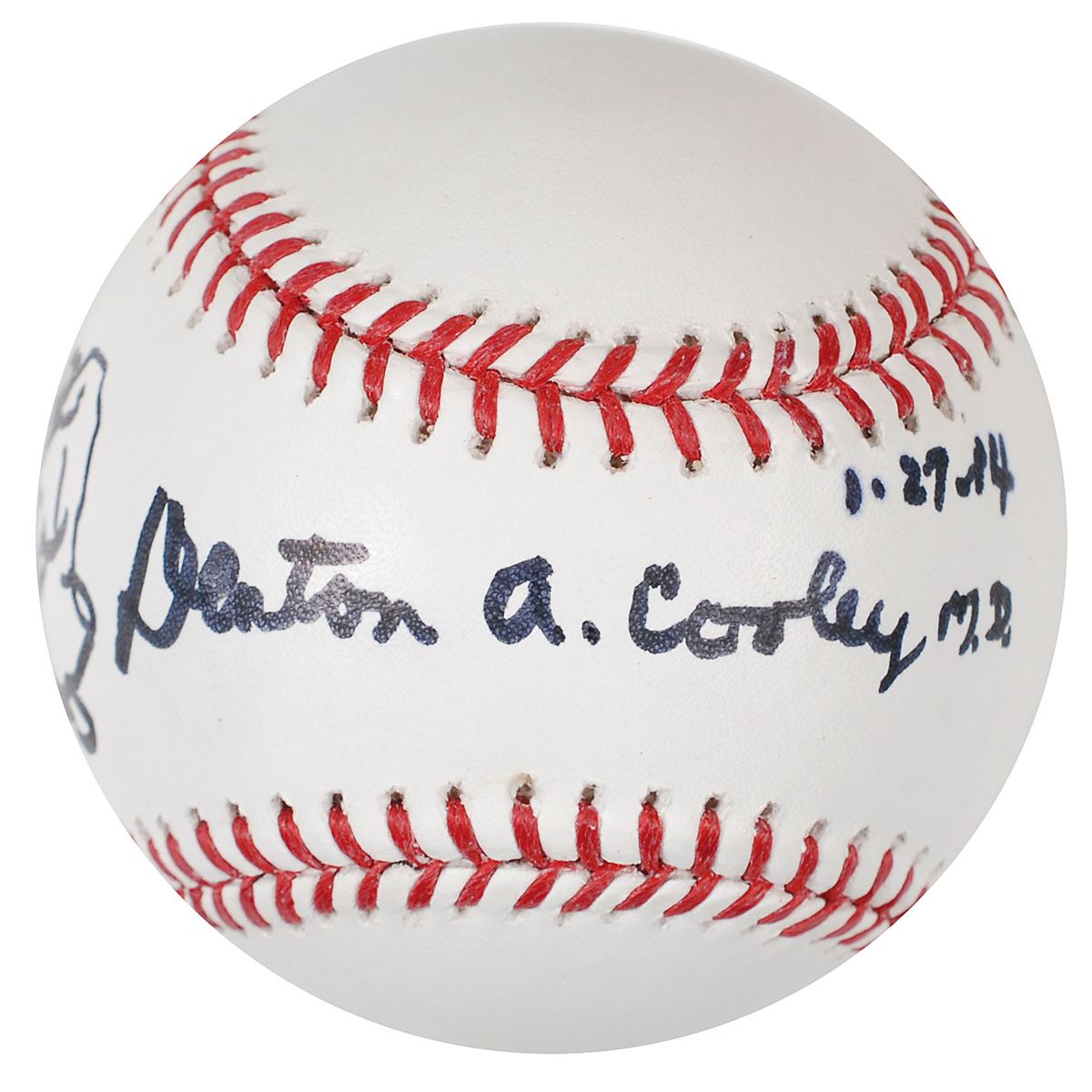 American heart surgeon (born 1920) best known for performing the first artificial heart transplant in 1969. Official Rawlings Major League (Selig) baseball signed in black felt tip on the sweet spot, “Denton A. Cooley, M.D., 1.27.14,” who adds a sketch of a heart on a side panel. In fine condition, with slight spreading to the date.