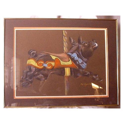 An original pastel drawing of a Dentzel Carousel Pig by Alice DeCaprio, and is signed by the famous artist.<p>The picture stands 24 1/2" Tall, by 30 1/2" wide, and is 1 1/4" thick. In excellent condition.<p>The drawing is triple matted, and is in a gold metal frame. All you have to do is to hang it on the wall.<p>Dominating the center of this picutre is a large black carousel pig, a blue bow around his neck, resting on a brass pole. The saddle, saddle pad and trappings are in brown, orange, yellow and blue. The background is brown. The mat colors are brown, mellon and white.<p>We will be offering more limited editions and signed artwork by this talented comtemporary artist in the future. Alice DeCaprio is one of the first artists involved with the resergence of the carousel market in the 1980's, she is well known thoughout the carousel world. She has a wonderful sence of color and form, the animals are true to the originals.