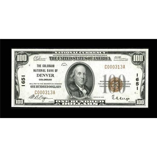 <B>Denver, CO</B></I> - $100 1929 Ty. 1 <B>The Colorado NB</B></I> Ch. # 1651<BR> The folds are hard to see on this C-note from this Berger family operated bank. <B>Extremely Fine.</B></I><BR><BR><b>Shipping:</b> Coins & Currency (<a target="_blank" href="http://www.heritageauctions.com/common/shipping.php">view shipping information</a>)