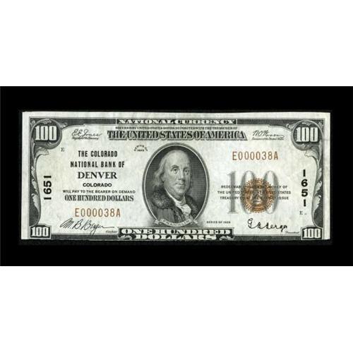 <B>Denver, CO</B></I> - $100 1929 Ty. 1 <B>The Colorado NB</B></I> Ch. # 1651<BR> Although there were no less than 20 issuing banks in Denver, only three issued the $100 denomination in the 1929 series. A nice note from this state capital. <B>Choice About Uncirculated</B></I>.<BR><BR><b>Shipping:</b> Coins & Currency (<a target="_blank" href="http://www.heritageauctions.com/common/shipping.php">view shipping information</a>)