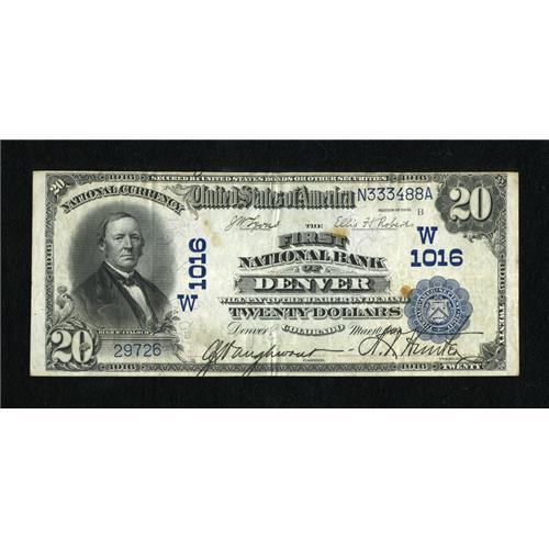 <B>Denver, CO</B></I> - $20 1902 Date Back Fr. 642 <B>The First NB</B></I> Ch. # (W)1016<BR>Engraved signatures of the bank's officers are seen on this original issue. There are a couple of spots worthy of mention, but do little to distract from the overall <B>Very Fine.</B></I> grade.<BR><BR><b>Shipping:</b> Coins & Currency (<a target="_blank" href="http://www.heritageauctions.com/common/shipping.php">view shipping information</a>)