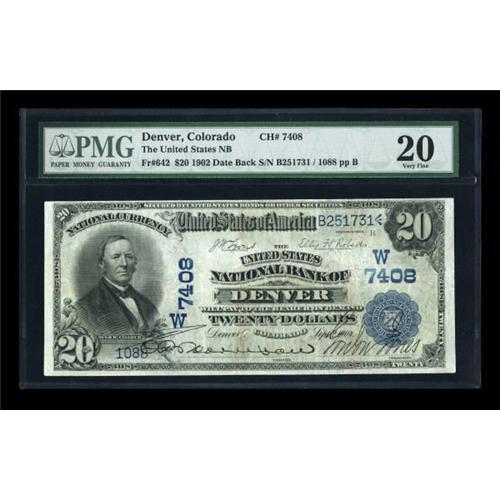 <B>Denver, CO</B></I> - $20 1902 Date Back Fr. 642 <B>The United States NB</B></I> Ch. # 7408<BR> Pleasing signatures are seen on this forbidden title note. <B>PMG very Fine 20</B></I>.<BR><BR><b>Shipping:</b> Coins & Currency (<a target="_blank" href="http://www.heritageauctions.com/common/shipping.php">view shipping information</a>)