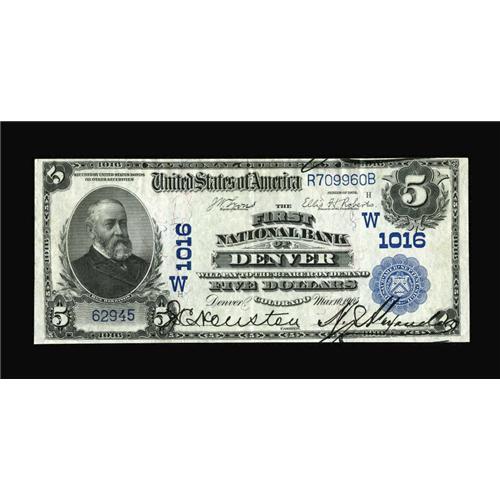 <B>Denver, CO</B></I> - $5 1902 Plain Back Fr. 598 <B>The First NB</B></I> Ch. # (W)1016<BR>A high grade large example from the first bank chartered in what was then the Colorado Territory. Bright <B>Extremely Fine,</B></I> with a miniscule repair at the bottom.<BR><BR><b>Shipping:</b> Coins & Currency (<a target="_blank" href="http://www.heritageauctions.com/common/shipping.php">view shipping information</a>)