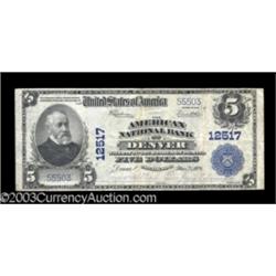 <TABLE cellSpacing=0 cellPadding=0 width="100%" bgColor=#000000 border=0><TBODY> <TR><TD width="100%"><TABLE cellSpacing=1 cellPadding=3 width="100%" border=0><TBODY><TR><TD width="100%" bgColor=#79735c><FONT face=arial color=#ffffff size=3><B>Description</B> </FONT></TD></TR><TR><TD width="100%" bgColor=#ffffff><FONT face=arial size=2><B>Denver, CO</B></I> - $5 1902 Plain Back Fr. 609 <B>The American NB</B></I> Ch. # 12517<BR>Chartered in 1924, this bank issued only $5 Plain Backs and the $5 denomination in both types of the 1929 series. This <B>Very Fine</B></I> example is the variety with two bank serial numbers. (200-300 ) </FONT></TD></TR></TBODY></TABLE></TD></TR></TBODY></TABLE><BR><TABLE cellSpacing=0 cellPadding=0 width="100%" bgColor=#000000 border=0><TBODY><TR> Important notice: Heritage usually auctions material at the rate of 200-250 lots per hour. On some occasions eBay Live bid software or the Internet may not be able to keep up with the pace of the auction. We recommend placing a realistic absentee bid now as insurance to avoid disappointment. Occasionally the auctioneer may eliminate or reject an eBay Live bid, and the auctioneer may also reopen a lot after the close of the eBay live bidding (usually because we missed an audience bid), and may reject your bid even if it shows you as the winning bidder. By bidding via eBay Live, you agree that Heritage may award the lot to another bidder at its sole discretion under the circumstances described above or any other reasonable circumstances. Also please note that all Heritage lots purchased through eBay Live carry a 20% Buyer's Premium. Please make sure you read the Terms and Conditions before you bid.</TR></TBODY></TABLE>