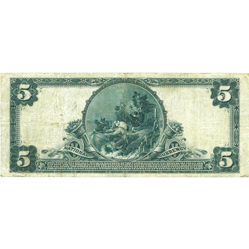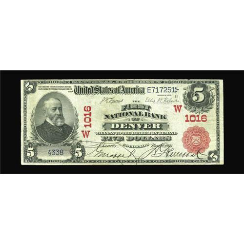 <B>Denver, CO</B></I> - $5 1902 Red Seal Fr. 587 <B>The First NB</B></I> Ch. # (W)1016<BR>This is a most attractive Red Seal which has been hidden away in a collection for over two decades. It is one of only eleven $5 Red Seals reported from all banks in Colorado combined, and the only Red Seal from this bank that has been available in nearly ten years. This historic institution was the first bank in Colorado to receive a national charter, and was long headed by legendary Colorado financier and railroad magnate David Moffat, for whom the Moffat tunnel and Moffat County are named. Two members of the Moffat family, which long controlled this bank, signed this example. This specimen is an evenly circulated and utterly problem free note with great color and loads of eye appeal. Expect to see plenty of action on this lot before the hammer falls this evening. <B>Fine-Very Fine.</B></I>