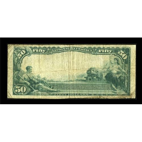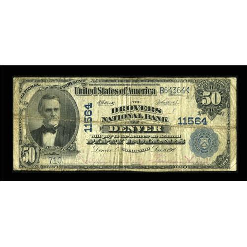 <B>Denver, CO</B></I> - $50 1902 Plain Back Fr. 683<B> The Drovers NB</B></I> Ch. # 11564<BR> A very rare type from here whose only emissions were Third Charter PB's in all denominations. Purple signatures are still legible though the bottom edge is a bit rough. <B>Fine.</B></I><BR><BR><b>Shipping:</b> Coins & Currency (<a target="_blank" href="http://www.heritageauctions.com/common/shipping.php">view shipping information</a>)