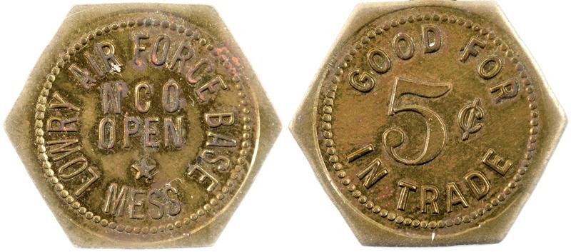 Obverse: Lowry Air Force Base/ NCO / Open / Mess; Reverse: Good For / 5c / In Trade. Fine condition, with some corrosion on obverse.
