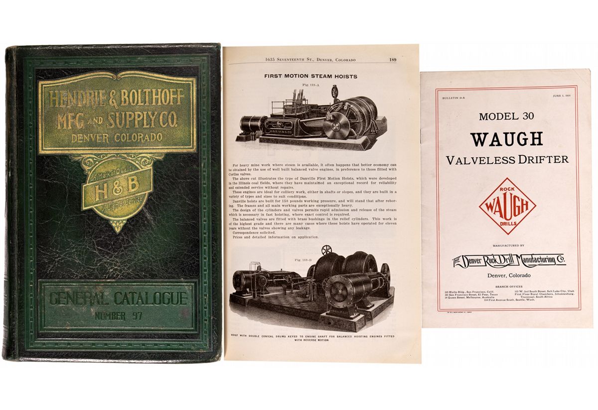 1) HENDRIE & BOLTHOFF MFG. AND SUPPLY CO. GENERAL CATALOG NUMBER 97. Wahlgreen Publishing Co., 1924, 1029 pages. Fully illustrated catalog of 7 types of chisels, cast iron tools, clamps, wrenches, calipers, drills, arc welding equipment, pump oilers, 19 different types of jacks, and hundreds of other tools, machines, and equipment. Hard bound, green and gold embossed cover, minimal wear. 2) A slim “MODEL 30 WAUGH VALVELESS DRIFTER” June 1914 bulletin. Handsome tricolor (red, black, white) plates of rock drills. Very detailed schematics of drills included. Minimal wear. - Ken & Rosemary Roberts Collection -59931