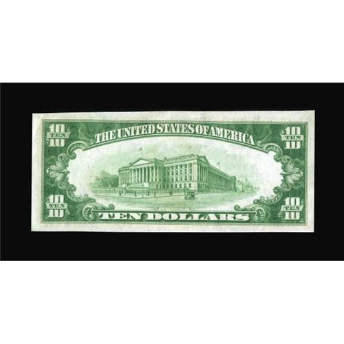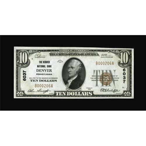 <B>Denver, PA</B></I> - $10 1929 Ty. 1 <B>The Denver NB</B></I> Ch. # 6037<BR> Bright, fresh, and better centered than many of the notes from this hoard. <B>Crisp Uncirculated,</B></I> with a minor corner bend that affects nothing. It came to us in an old A&A Coins holder marked $35, giving some idea of when it was purchased by our consignor. <BR><BR><b>Shipping:</b> Coins & Currency (<a target="_blank" href="http://www.heritageauctions.com/common/shipping.php">view shipping information</a>)
