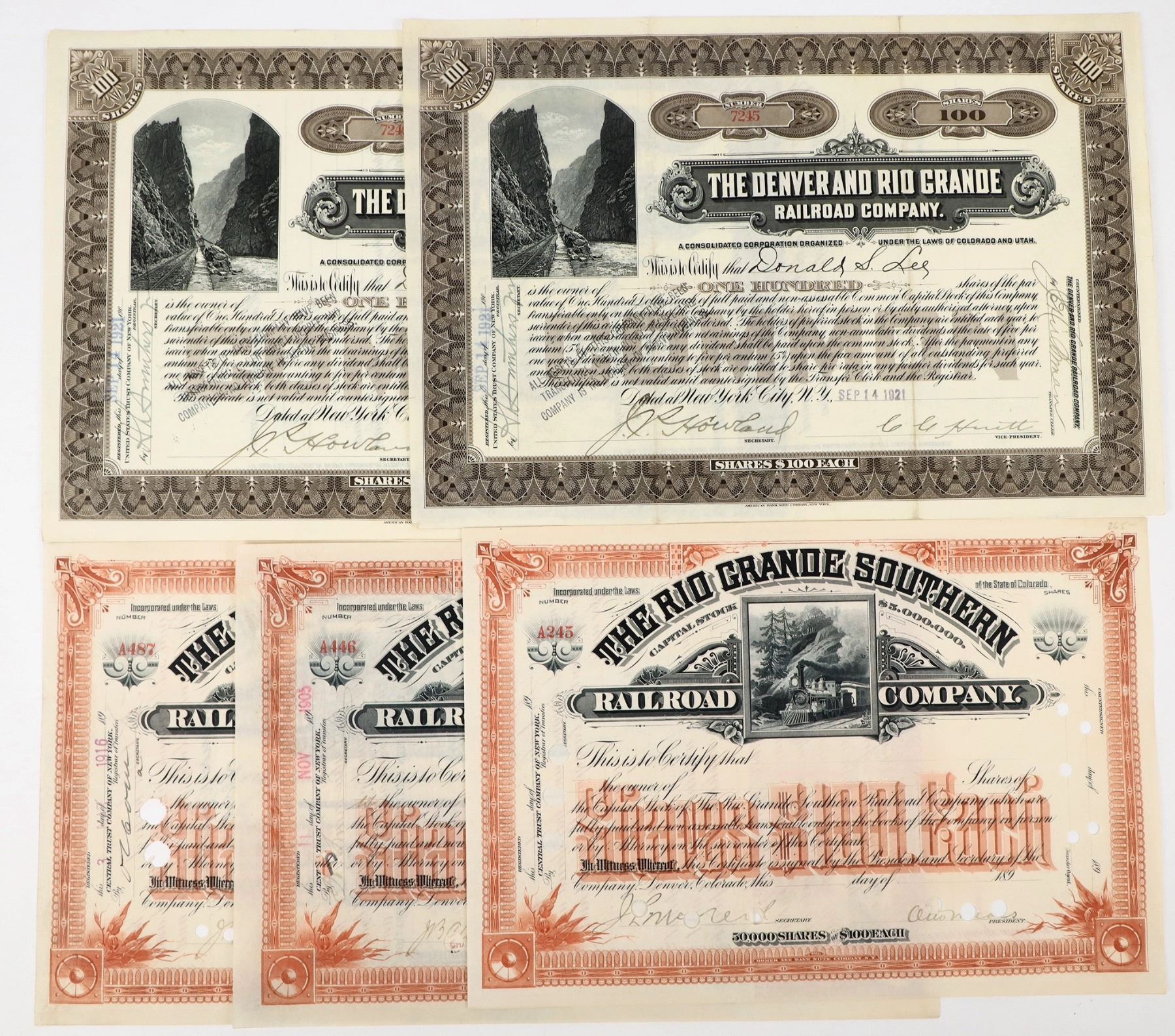 Lot of 5. 1-3) Three stocks for the Rio Grande Southern Railroad. Issued 1905 and 1916, punch cancelled. One 1890s unissued but signed by Otto Mears as president. Also punch cancelled. 4-5) Two stocks issued for the Denver and Rio Grande Railroad Company. Issued in 1921, not cancelled. Vignette of tracks in Glenwood Canyon.