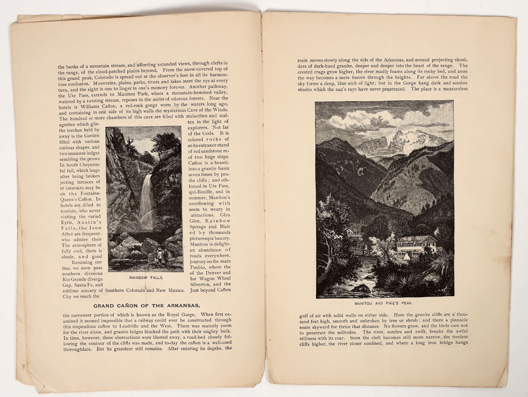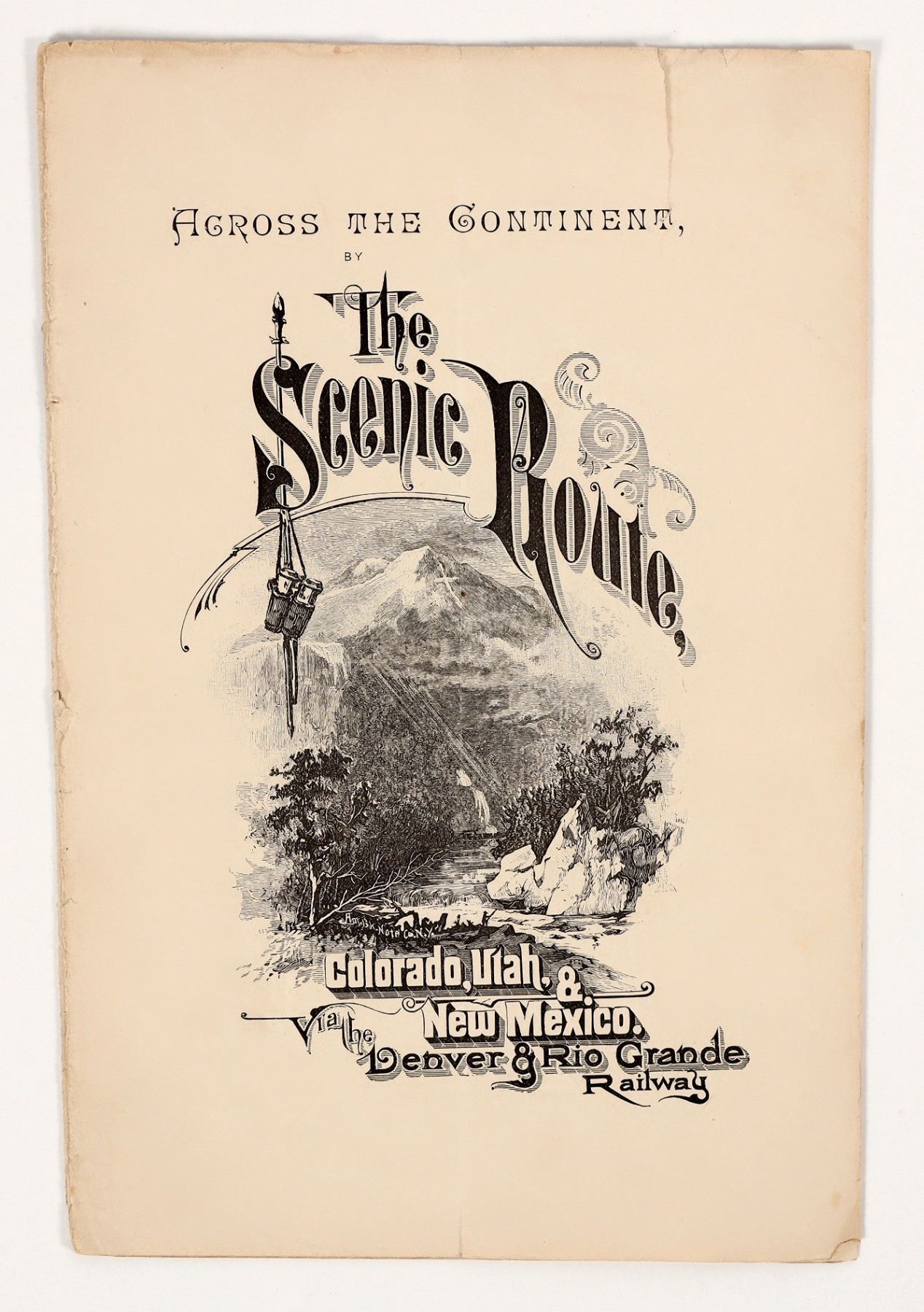 RARE, "The Scenic Route", via the Denver & Rio Grande Railway, now owned by Union Pacific Railway. Paperback booklet, detailing the scenic way to travel through CO, UT, & NM by rail, with pictures. Appears to be complete 6 pages, front and back, bound with staples, and a detached cover page with 1.2" tear. One vertical crease through all pages. Good condition, light foxing on the last page. Measures 5.5x8.5", see photo.