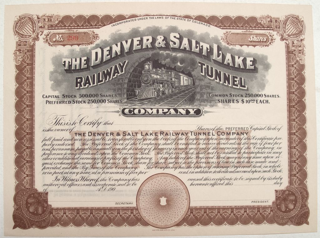 We have not seen this stock before. Unissued. David Moffat intended to build a 2.6 mile tunnel under Rollins Pass (The Denver & Salt Lake Railway Tunnel), but it was never built. Instead, he built his railroad (The Denver Northwestern & Pacific) over Rollins Pass in 1904, and the company that was intended to build the tunnel never got off the ground (the plan was to have a separately incorporated company build the tunnel and lease it back to the railroad). GREAT HISTORY!