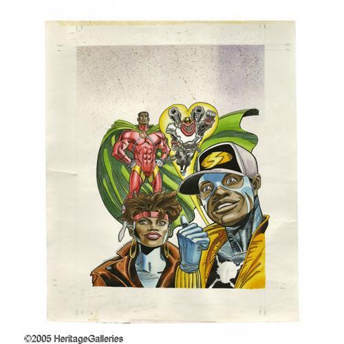 <B>Denys Cowan and James Sherman - "Comic Book Business" Book Cover Original Art (1994).</B></I> Hardware, Icon, Rocket, The Question, and Static highlight this "Milestone" cover illustration penciled by Denys Cowan. Inked and hand-painted in watercolor and dyes on bristol board by James Sherman. Includes a tear sheet of <B>Comic Book Business</B></I>, which features this illustration. The image area measures 13" x 17.5", and, aside from a tear in the left and right edges (outside of the image area), the condition is Very Good.