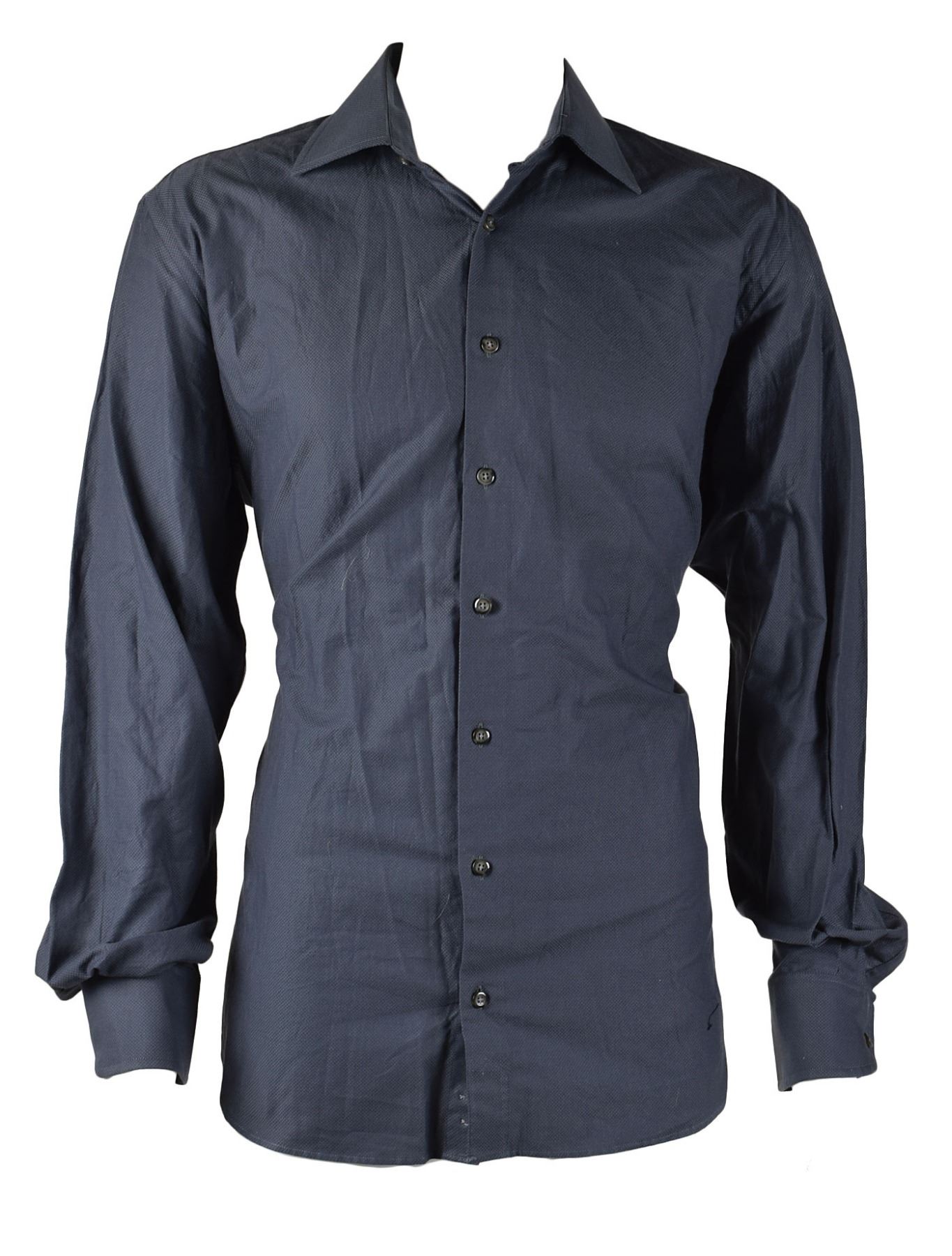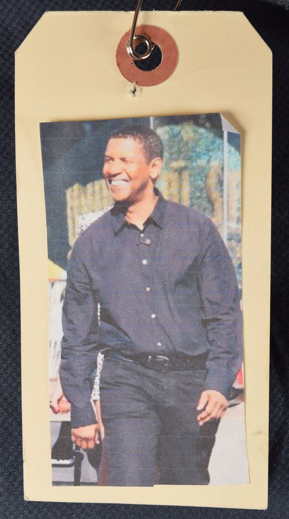 Dark gray long-sleeve button-up dress shirt, worn on screen by Denzel Washington in his role as Bob McCall in the 2014 neo-noir thriller The Equalizer. Sewn inside the collar is a "CEGO, Custom Shirtmaker, New York" label. In fine condition.