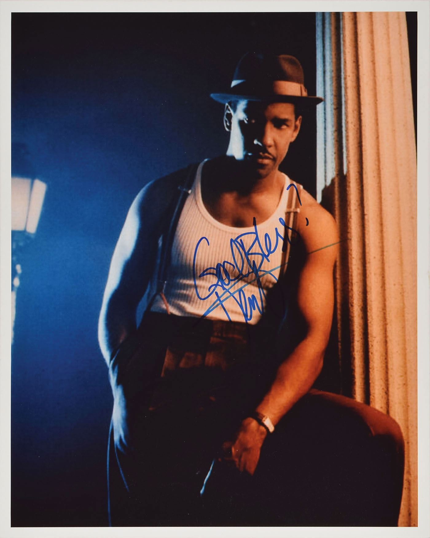 Color semi-glossy 12 x 15 photo of Washington as Ezekiel 'Easy' Rawlins from the 1995 film Devil in a Blue Dress, signed in blue felt tip, "God Bless! Denzel." In fine condition.