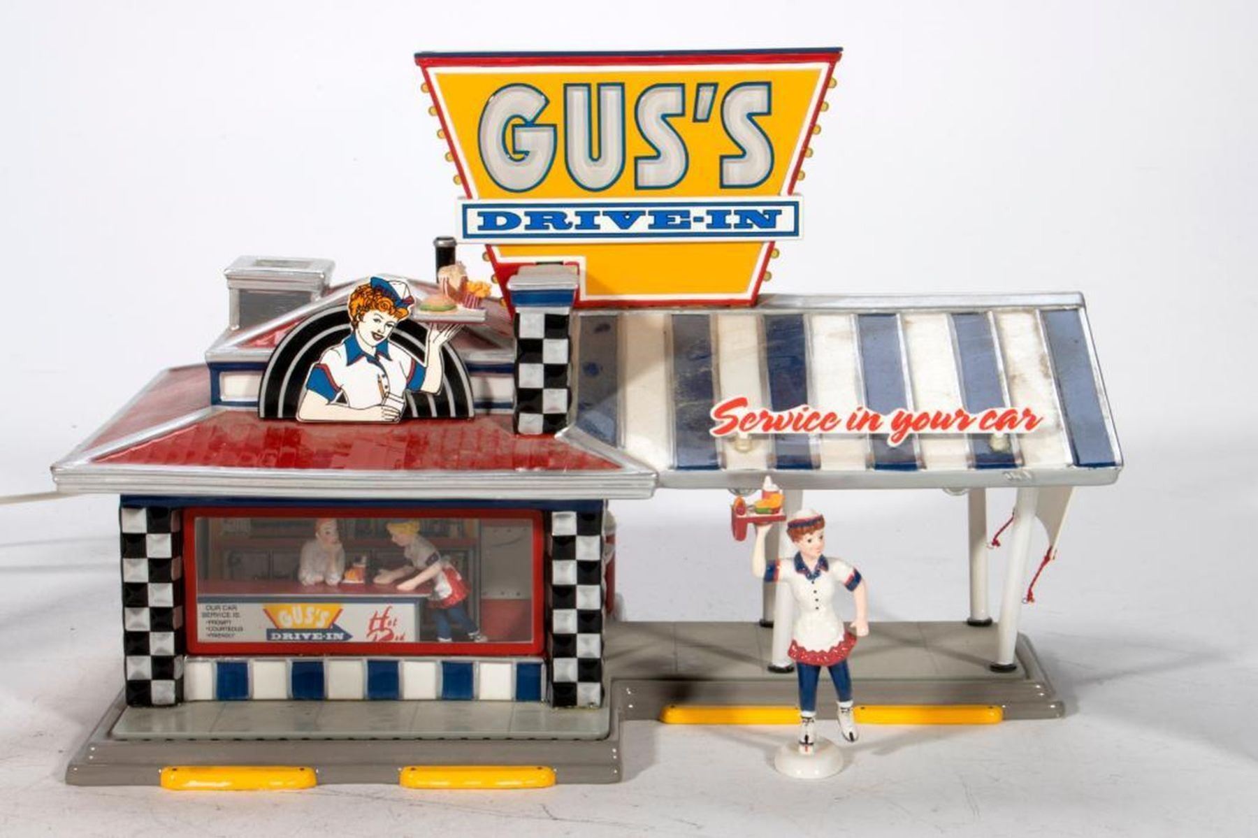 Drive in is lighted, car and waitress with damage; Fall colors trees; Subway Entrance