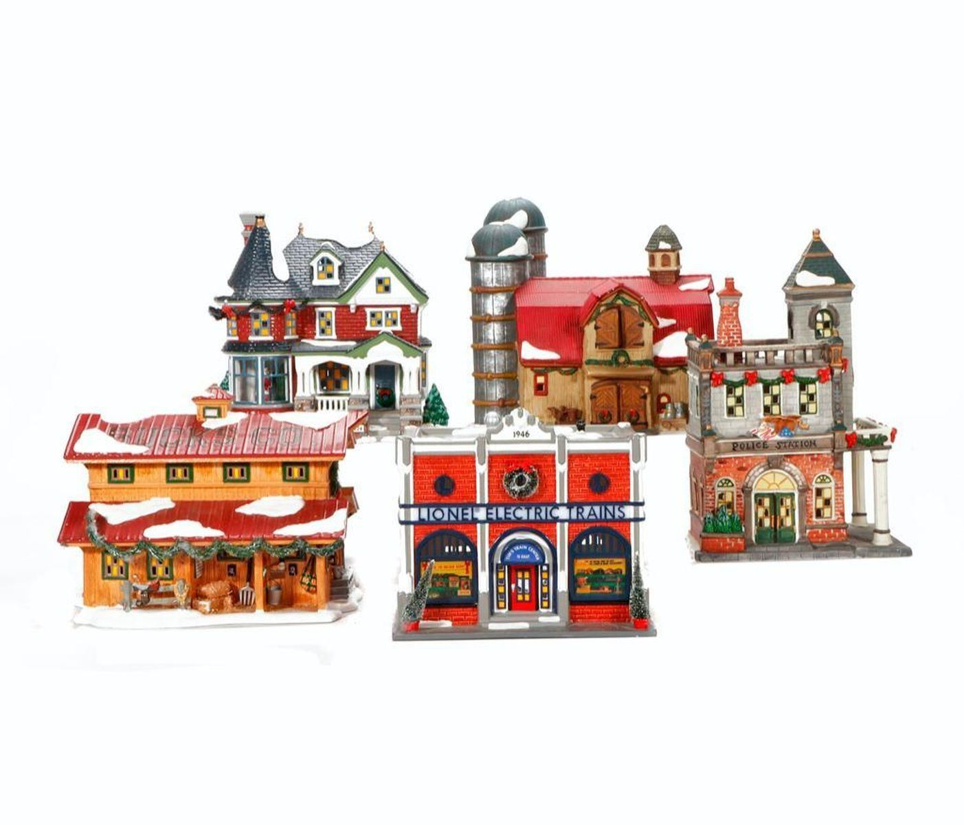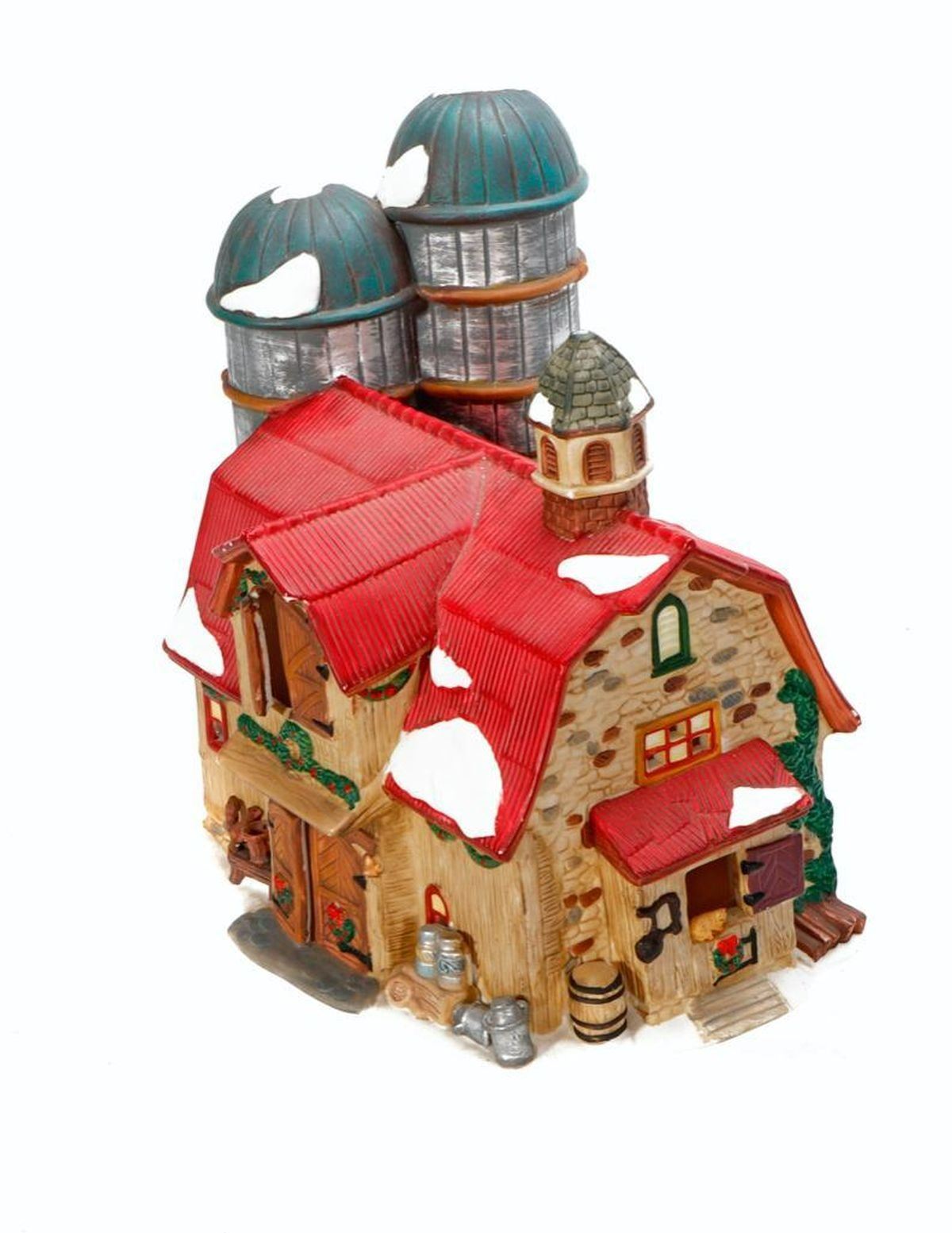Department 56 Snow Village Series, Heartland Valley and Holiday Expressions Buck's County Horse Barn Lionel Electric Train Shop 1224 Kissing Claus Lane Heartland Valley Deluxe Porcelain Lighted House Barn and Silos Deluxe Porcelain Lighted House Police Station Holiday Expressions Footbridge All in well worn original packaging