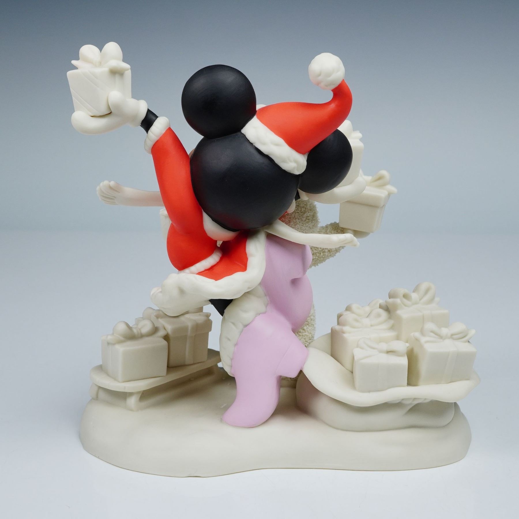 Porcelain Snowbabies Guest Collection figurine Look What We Have For Mickey depicting a Snowbaby and Minnie Mouse joyfully holding presents. Marked Department 56 and Disney to base.