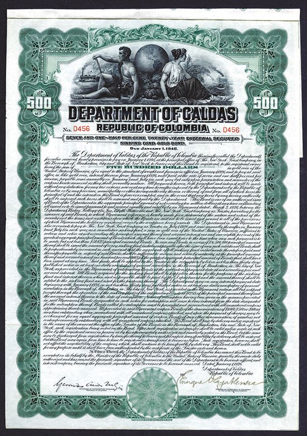 Colombia. 1926. $500 7 1/2% Twenty-Year External Secured Sinking Fund Gold Bond, I/U, Green border and undertint, Allegorical Male and female vignette with world, Columbian BNC.