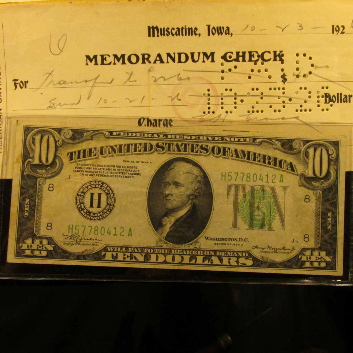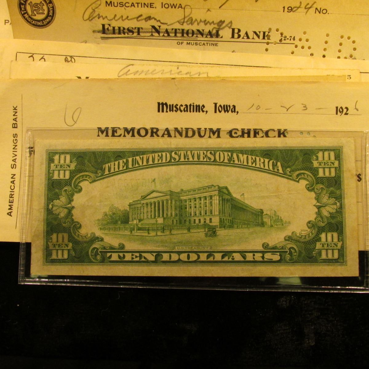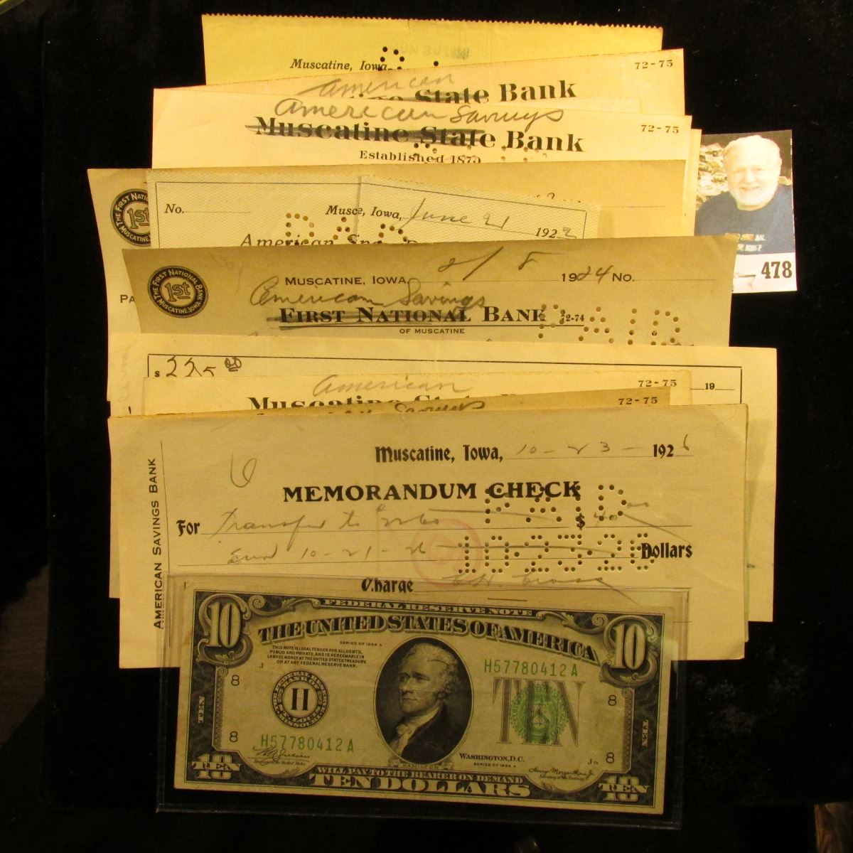 "Department of the Interior Bureau of Pensions Washington, D.C". Letter responding to a Pension claim; (14) Different cancelled checks from banks in Muscatine, Iowa; & Series 1934A $10 F.R.N., EF, plate numbers J75/1024.