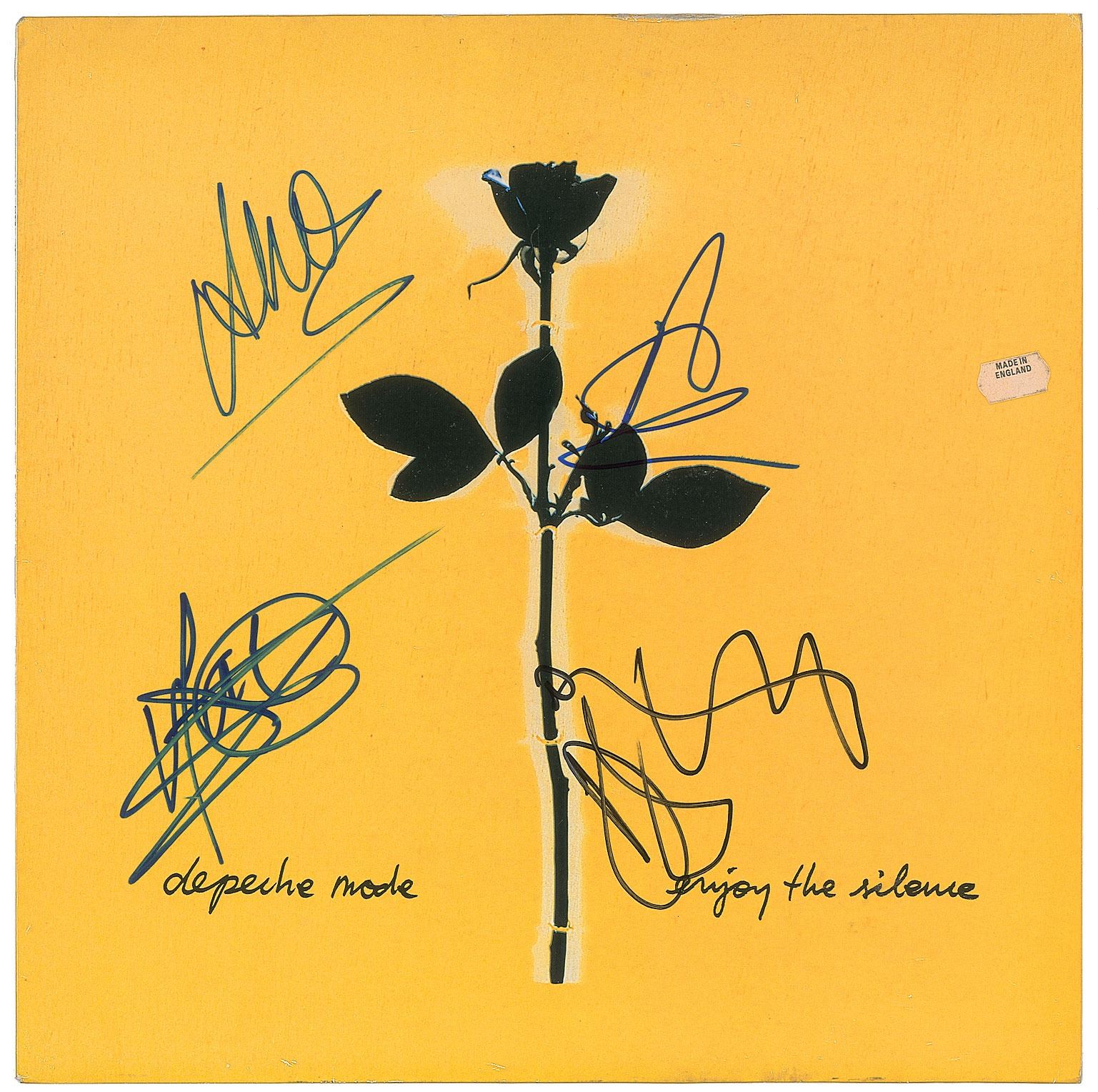 Enjoy the Silence 12? single album signed on the front cover in blue or black felt tip by David Gahan, Martin Gore, Alan Wilder, and Andrew Fletcher. In fine condition. The record is included.