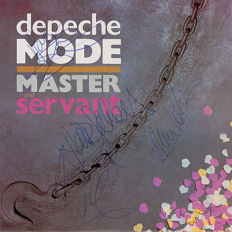 45 rpm record for ‘Master and Servant,’ signed on the front of the sleeve in blue ballpoint by Dave Gahan, Martin Gore, Alan Wilder, and Andy Fletcher. In fine condition. The record is included.