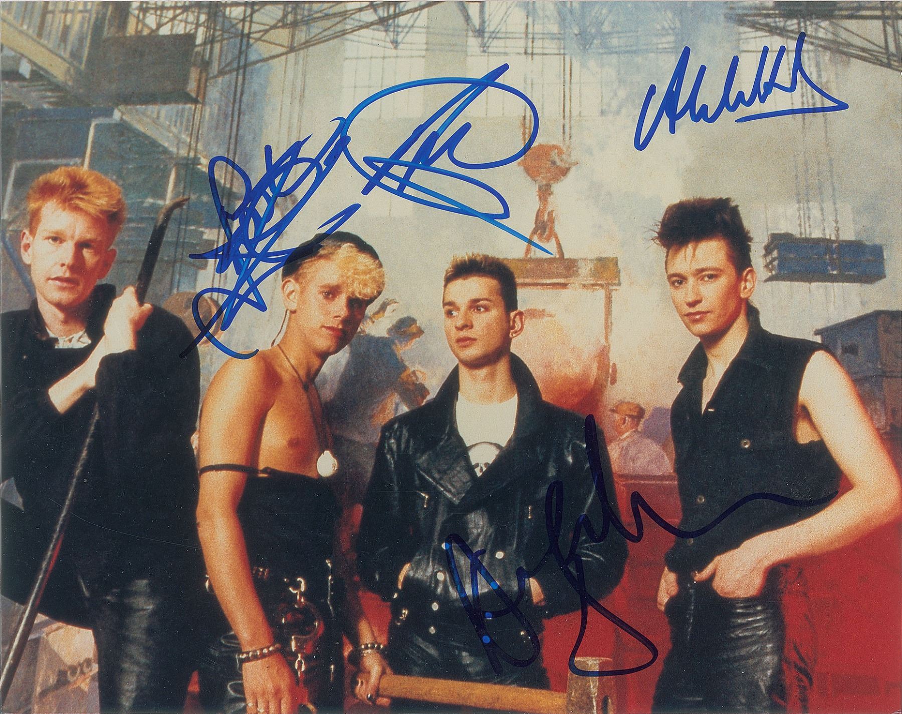 Color glossy 10 x 8 photo of the electronic rock band Depeche Mode, signed in blue felt tip by Alan Wilder, Dave Gahan, Martin Gore, and Vince Clarke. In very fine condition.
