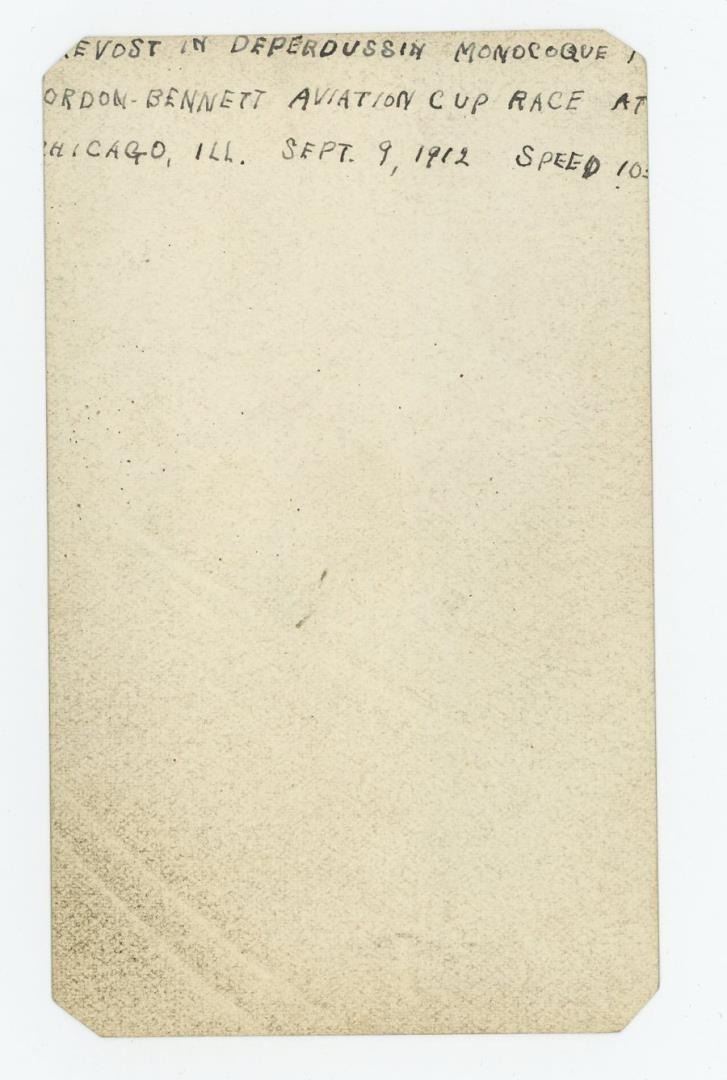 2 1/2" by 4". Full text on the back reads Maurice Prevost in Deperdussin Monocoque at the Gordon Bennett Aviation Cup Race At Chicago, Illinois. September 9, 1912, Speed 106 mph. This caption is erroneous, as Prevost flew the Deperdussin Monocoque in 1913, breaking the record that was set in 1912 by Jules Védrines - on Septermber 9, 1912 - in this photo. The Deperdussin Monocoque World Speed Record flight in Chicago, 1912, was a landmark achievement in early aviation, demonstrating the revolutionary potential of streamlined aircraft design. Piloted by Jules Védrines, the Deperdussin Monocoque—featuring a lightweight, aerodynamic plywood fuselage—set a world speed record of approximately 106 mph (171 km/h) during an international meet. The event, held in the Chicago area as part of major aviation exhibitions, showcased the transition from fragile biplanes to more advanced, high-performance aircraft and marked a significant step toward modern aeronautical engineering.