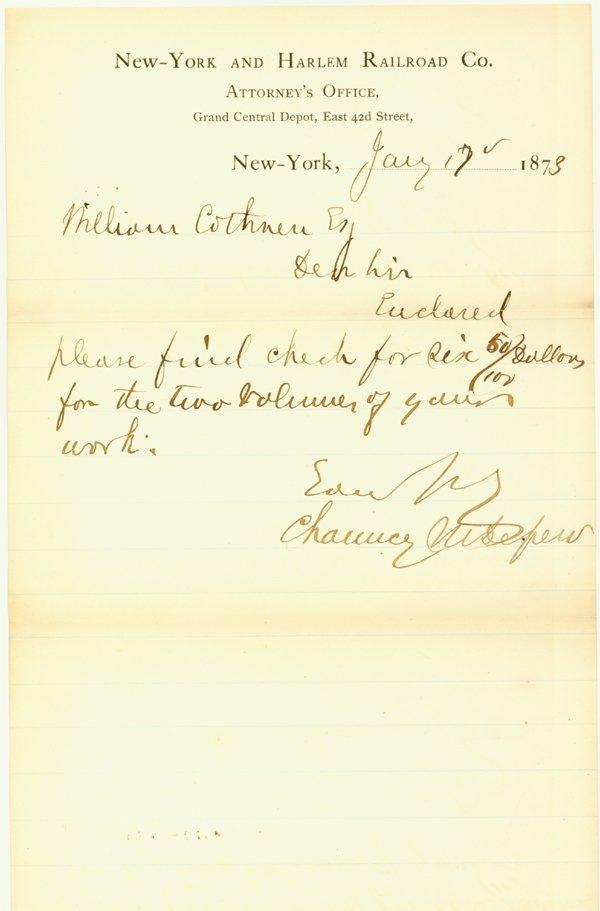 CHAUNCEY M. DEPEW (1834-1928). United States Senator from New York. Autograph Letter Signed, “Chauncey M. Depew,” on New-York and Harlem Railroad Co. Attorney’s Office, Grand Central Depot, East 42nd Street letterhead. One page, 5 ½” x 8 ½”. New York. January 17, 1873. Depew writes to inform his correspondent that he has enclosed a check for $6.50 for two volumes of his work. Extremely Fine.
