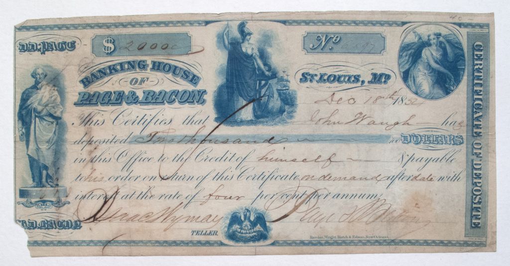 GOLD RUSH CERTIFICATE OF DEPOSIT, PAGE BACON, 1852: "Blue" Page Bacon & Co., Certificate Of Deposit, Dec.18, 1852, for $2,000.00, from StLouis Mo.(small piece missing from btm. l/h corner). Note on "Page Bacon"-Started by Henery Bacon & his father in 1848. Expanded into S.F.in 1849.Business flourished until 1855, when involvement in financing the Ohio & Missippi R/R, compelled the StLouis house to close. When the news reached S.F., a run on Page Bacon resulted in their suspension.City: StLouisCounty: State: MO