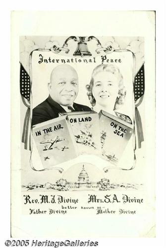 <B>Depression Era Black Leader Father Divine - Two Items</B></I> An African-American religious leader and founder of the Universal Peace Mission Movement between World War I and World War II. Born George Baker in Savannah, Georgia in 1882, he preached in the South before moving to Harlem in 1915, where he became one of the largest landlords in the neighborhood. He was a controversial, self-proclaimed "Black Messiah," often riding in a Rolls Royce and spending millions of dollars. His followers considered him to be the fulfillment of all biblical prophecies of the Messiah, his numerous detractors called him a madman and most social scientists considered him to be a cult leader. His group grew into the largest religious movement in the north during the depression. Father Divine was very active in early civil rights causes and is now looked upon with a bit more appreciation by many people. His health and influence declined during the 1940s. This lot contains two scarce original items. First is a book, <I>God in a Rolls Royce: the Rise of Father Divine, Madman, Menace Or Messiah?</B></I> by John Hosher, which takes a detailed look at this controversial black leader. Published in New York by Hillman-Curl in 1936; 272 pages; first edition; illustrated with photographs; cloth binding with the seldom-seen dust jacket (minor wear at top); tight binding; unobtrusive library stamps on back inside endpaper. The second item is a real photo postcard from the World War II era picturing Father and Mother Divine calling for "International Peace -- In the Air, On Land, On the Sea." Very fine condition. Two great items. Lot:250