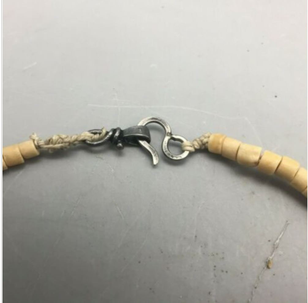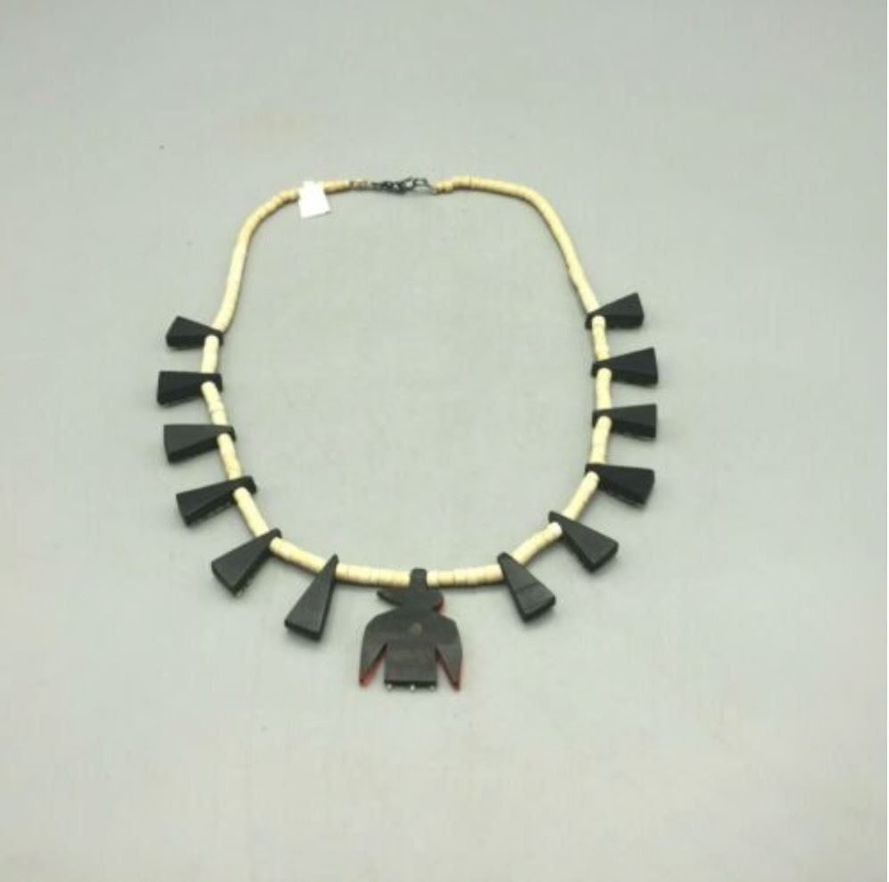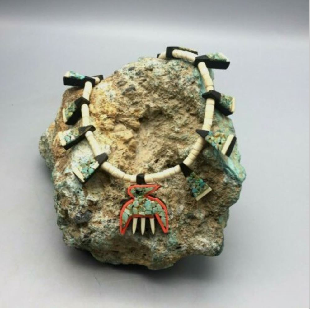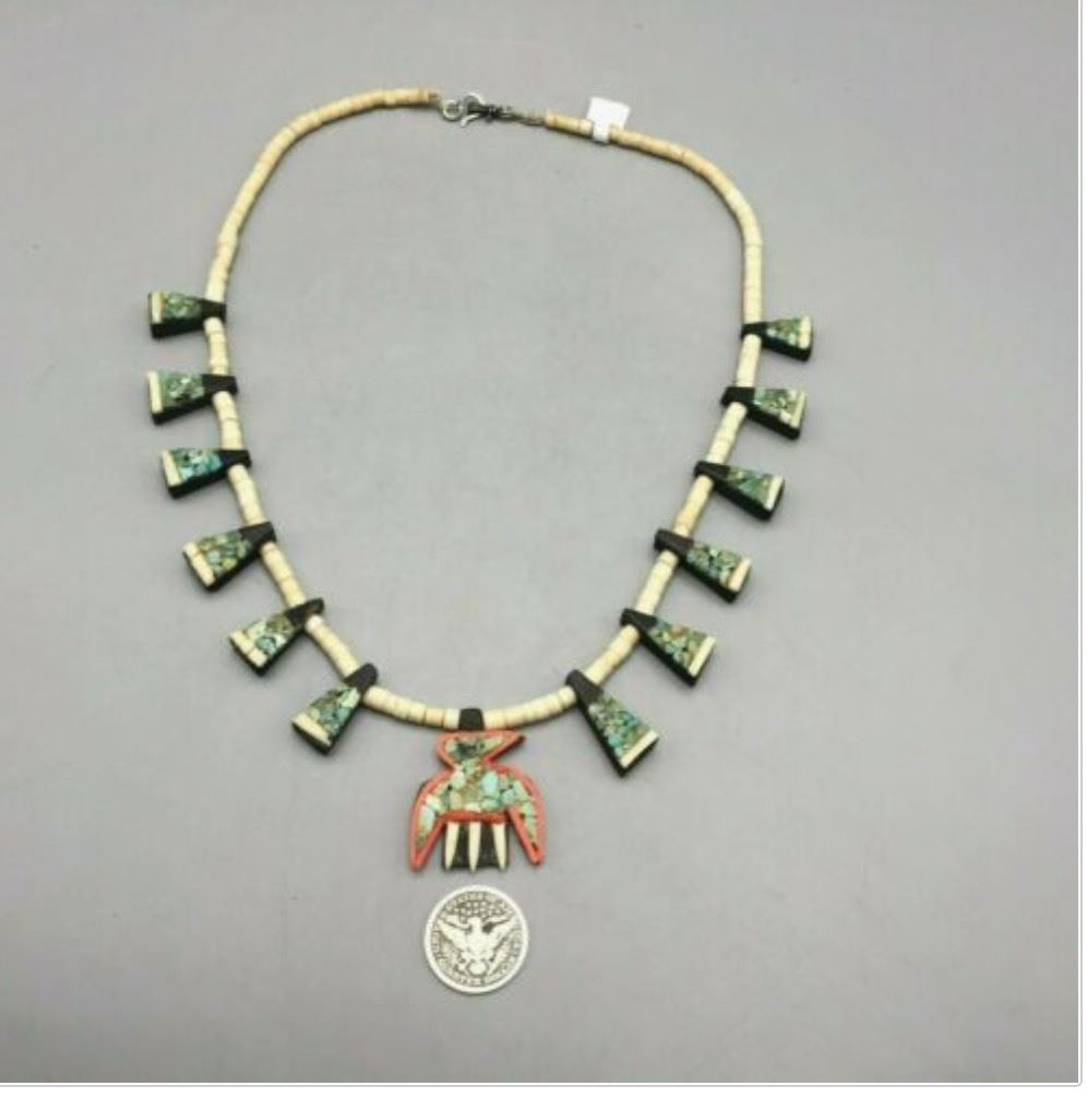 Description: This is a depression era, Santo Domingo "Tab" necklace from the famous, Jewel Box collection. The Jewel Box was owned by Morrey and Honeylou Resnick. They opened in 1949 and were located in downtown Phoenix. Later, it was moved to North Central Avenue, until it closed in May, 2006. Over the years, they amassed a large collection of Native American Jewelry. Several of their pieces were photographed in the famous Arizona Highways turquoise issues from the 1970s, including the well-known magazines of the January 1974 issue, the August 1974 issue and the March 1975 issue. Where possible, the Reznik's original tag with information has been left attached. This is a great, older, Santo Domingo necklace which features a thunderbird pendant. Recently restrung, but done old-school, and strung on waxed nylon cord. Maker: Unknown, Santo Domingo in style. Approx. Age: Circa 1920-1930s. Size: Measures 22" around the neck. Pendant is an additional 1-1/4" wide X 1-1/2" long. Weighs 48 g. Condition: Good for its age. Normal wear and minor imperfections expected on used and vintage items. Please look closely at the pictures as they are an important part of our description. Shipping: There will be a $5 handling / packaging fee for shipping this lot. The actual cost of postage will be added on top of that. BUY IT NOW: If you would like to buy this item now without waiting for the auction to end (this option is only available up to 48 hours before the auction starts to close), the “Buy it Now” price is the high estimate of this lot. If you would like to end the auction early and pay the high estimate (plus applicable fees), please contact us by phone or email and reference this lot.
