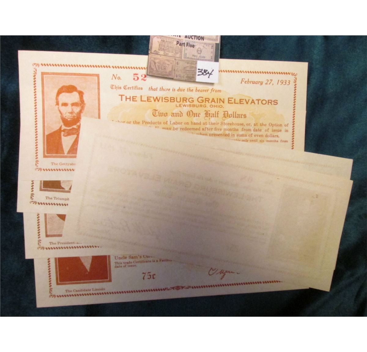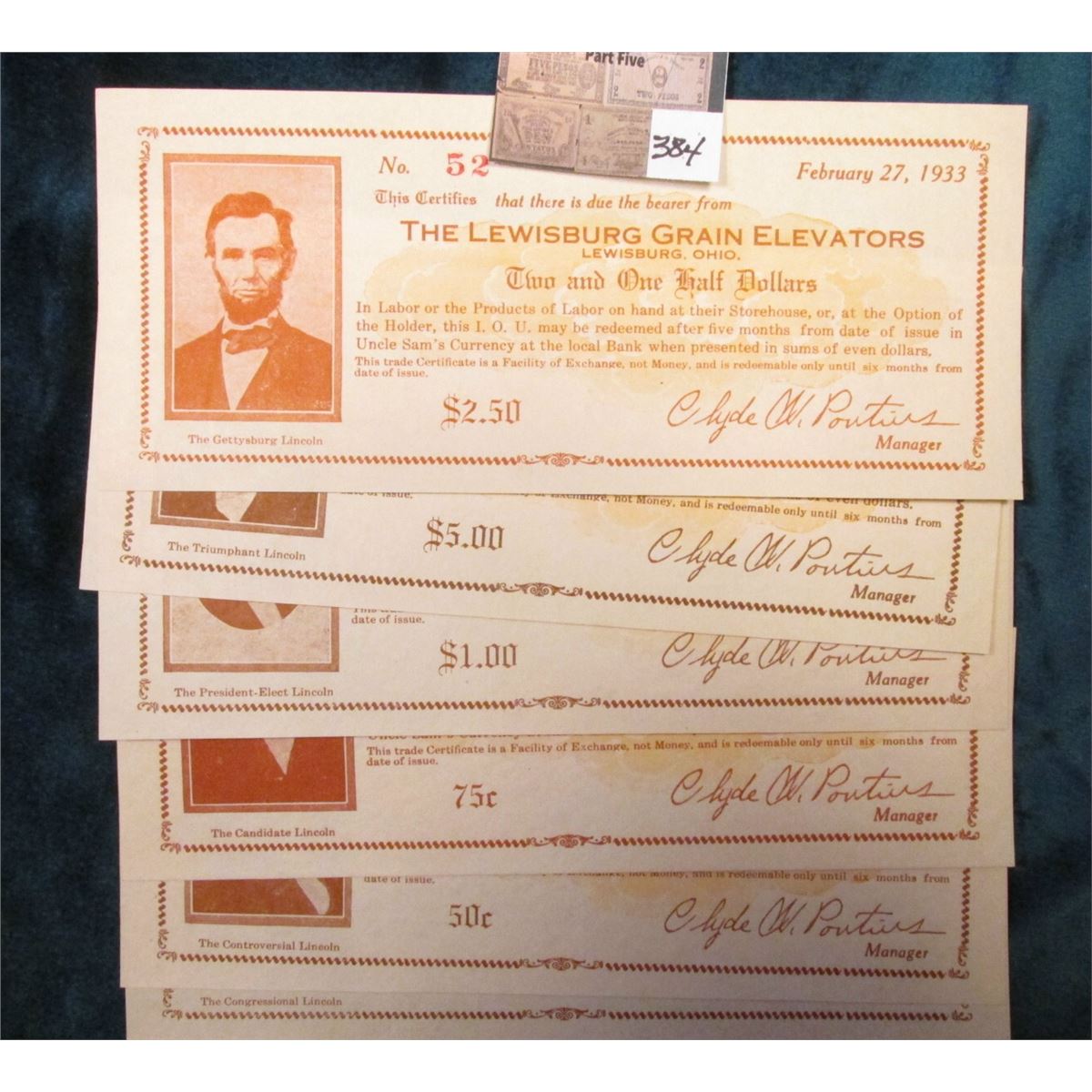 Depression Scrip 6-Piece Set of MS #: OH512-.25-5 "The Lewisburg Grain Elevator Lewisburg, Ohio" Includes .25c, .50c, .75c, $1, $2.50, & $5.00. All Mint condition.