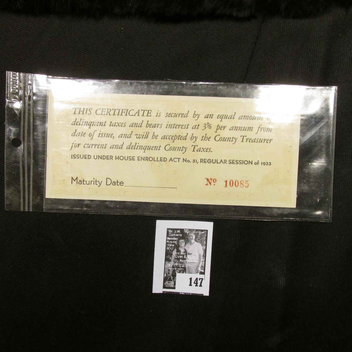 2. This is a public auction and mail bid sale conducted by a licensed and bonded auctioneer. There will be a 20% Buyer's Fee added to all invoices. There will be a 5% discount to people paying by cash, check, or money order through the internet. The auctioneer may open bidding at a reasonable price on each lot, usually 5 or 10% above the second highest mail bid, and may set bidding increments as he deems necessary. The auctioneer's